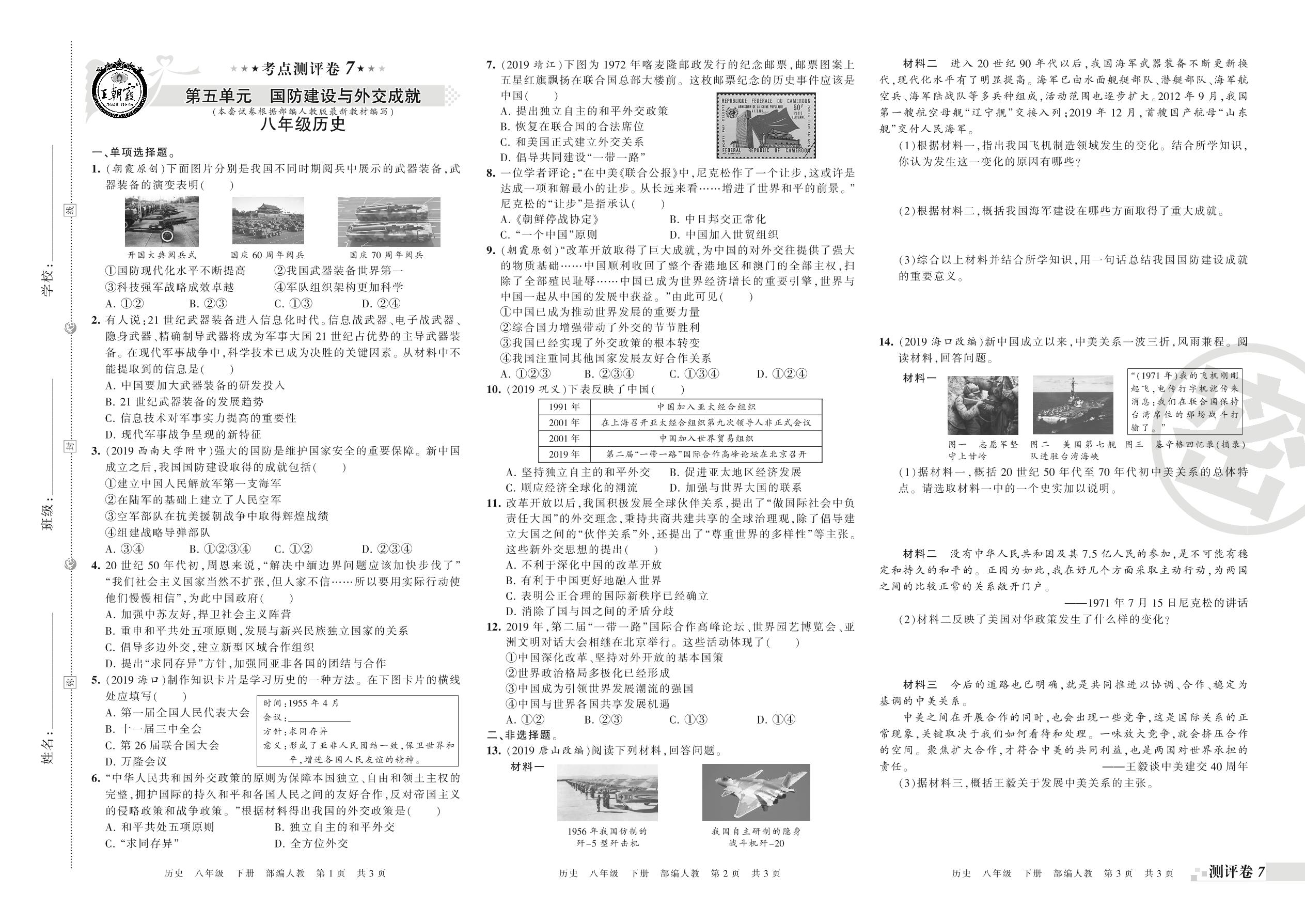 王朝霞期末测评卷——第五单元 国防建设与外交成就、第六单元 科技文化与社会生活八年级下册历史(人教版)【0】