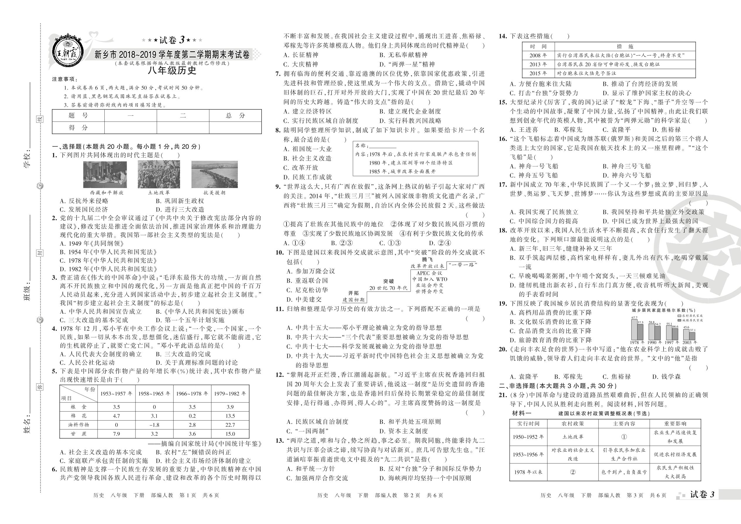 2018-2019学年第二学期新乡市八年级历史试卷(人教版)【3】