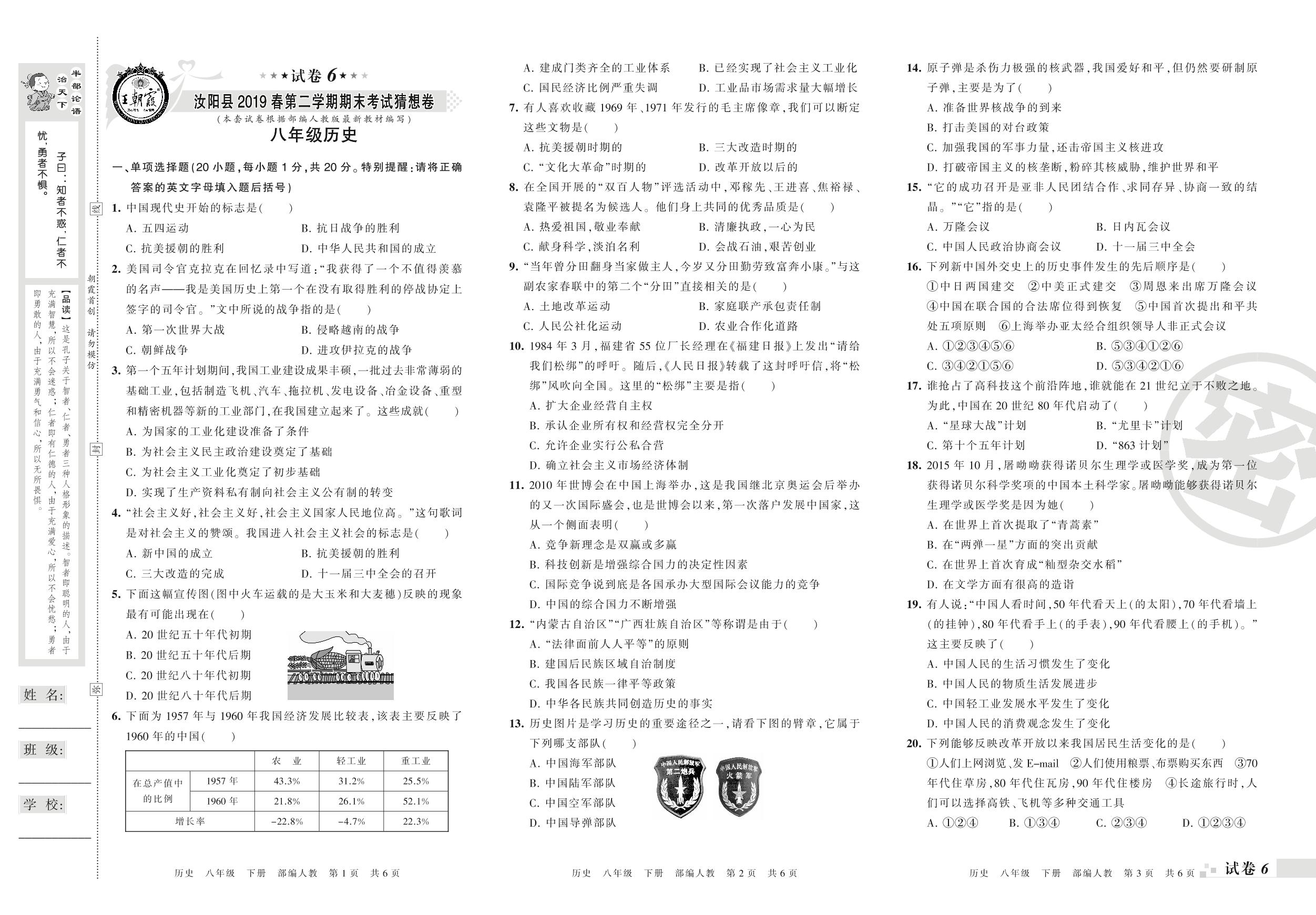2019春第二学期洛阳市汝阳县八年级历史试卷(人教版)【6】