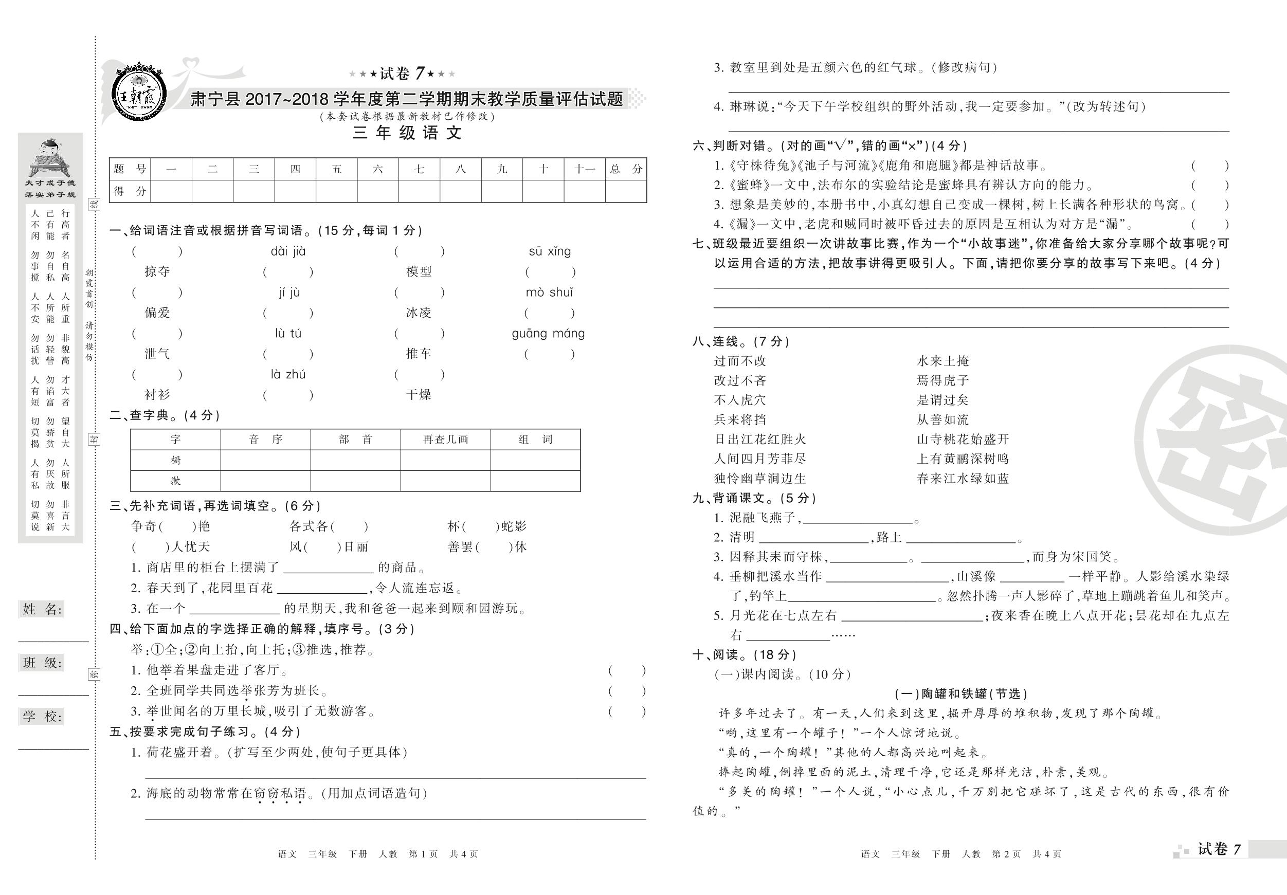 2017-2018学年第二学期沧州市肃宁县三年级语文试卷(人教版)【7】