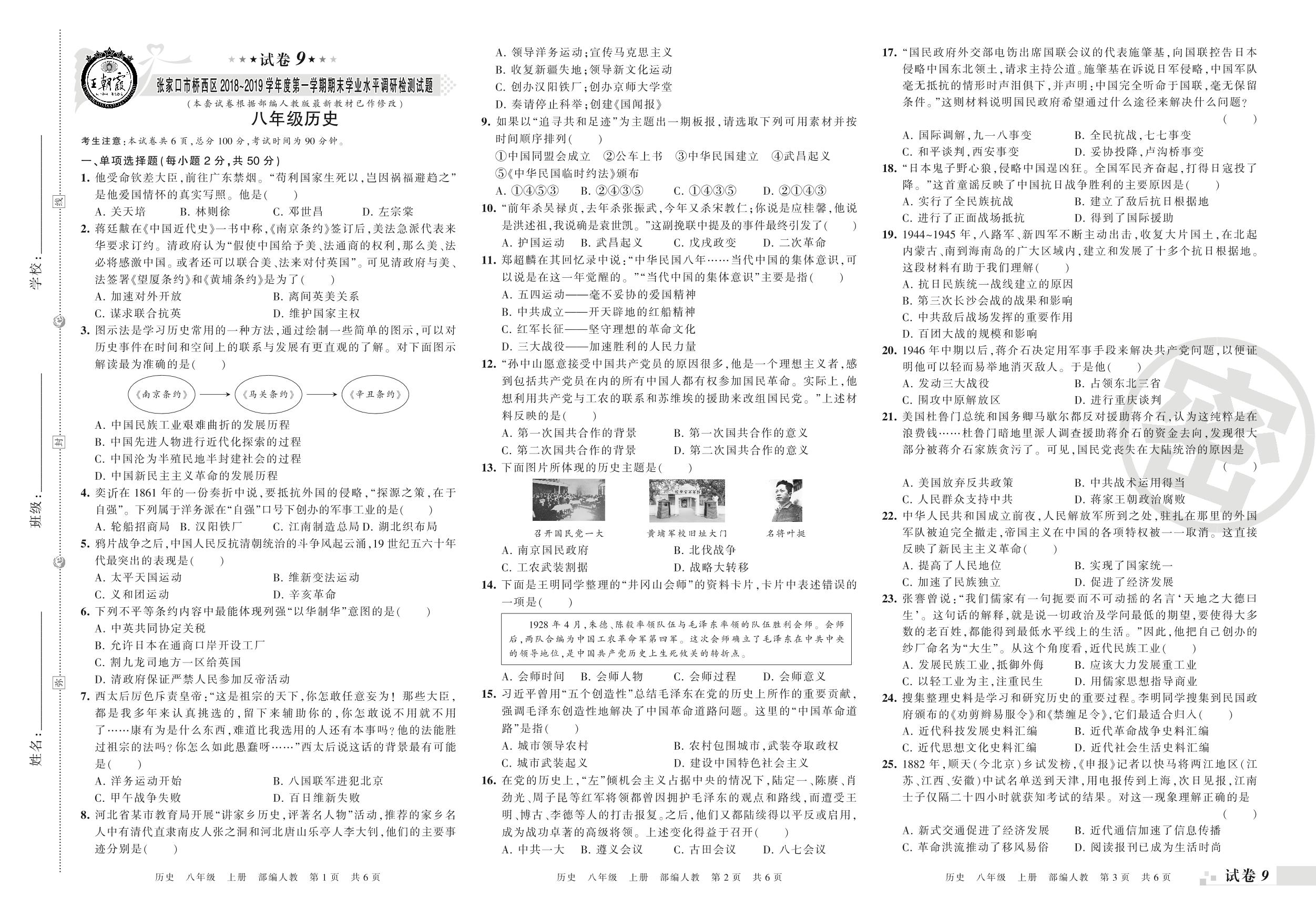 2018-2019学年第一学期张家口市桥西区八年级历史试卷(人教版)【9】