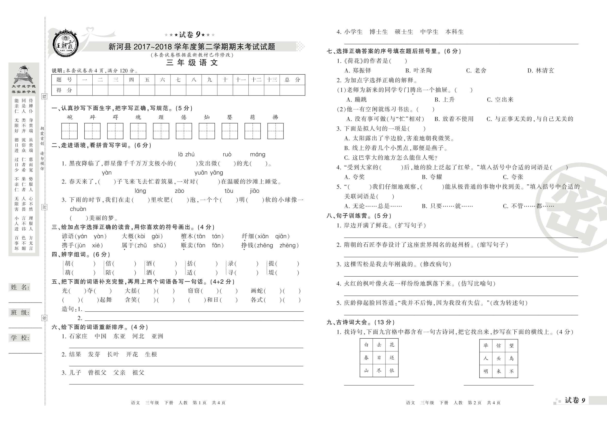 2017-2018学年第二学期邢台市新河县三年级语文试卷(人教版)【9】