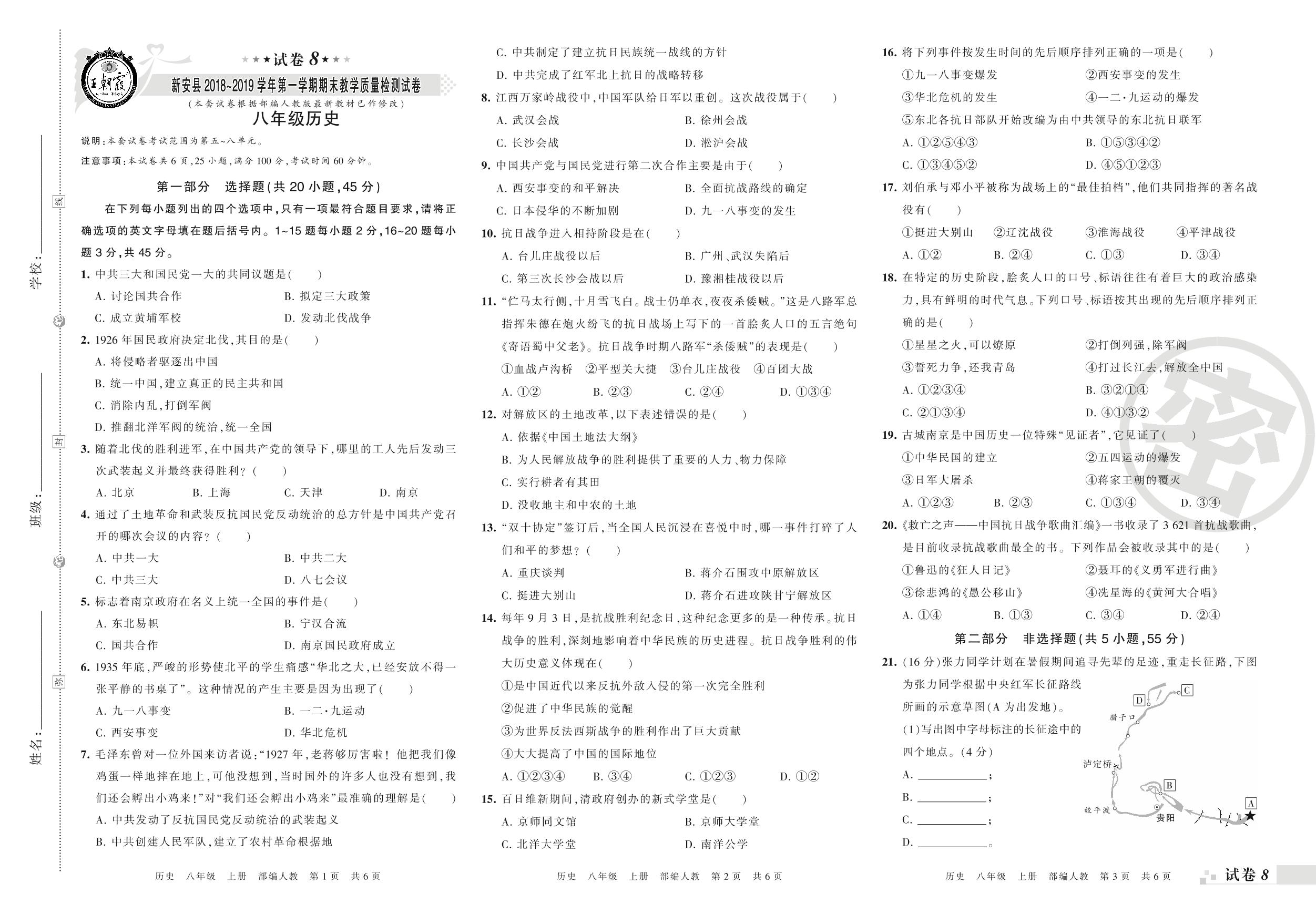 2018-2019学年第一学期洛阳市新安县八年级历史试卷(人教版)【8】