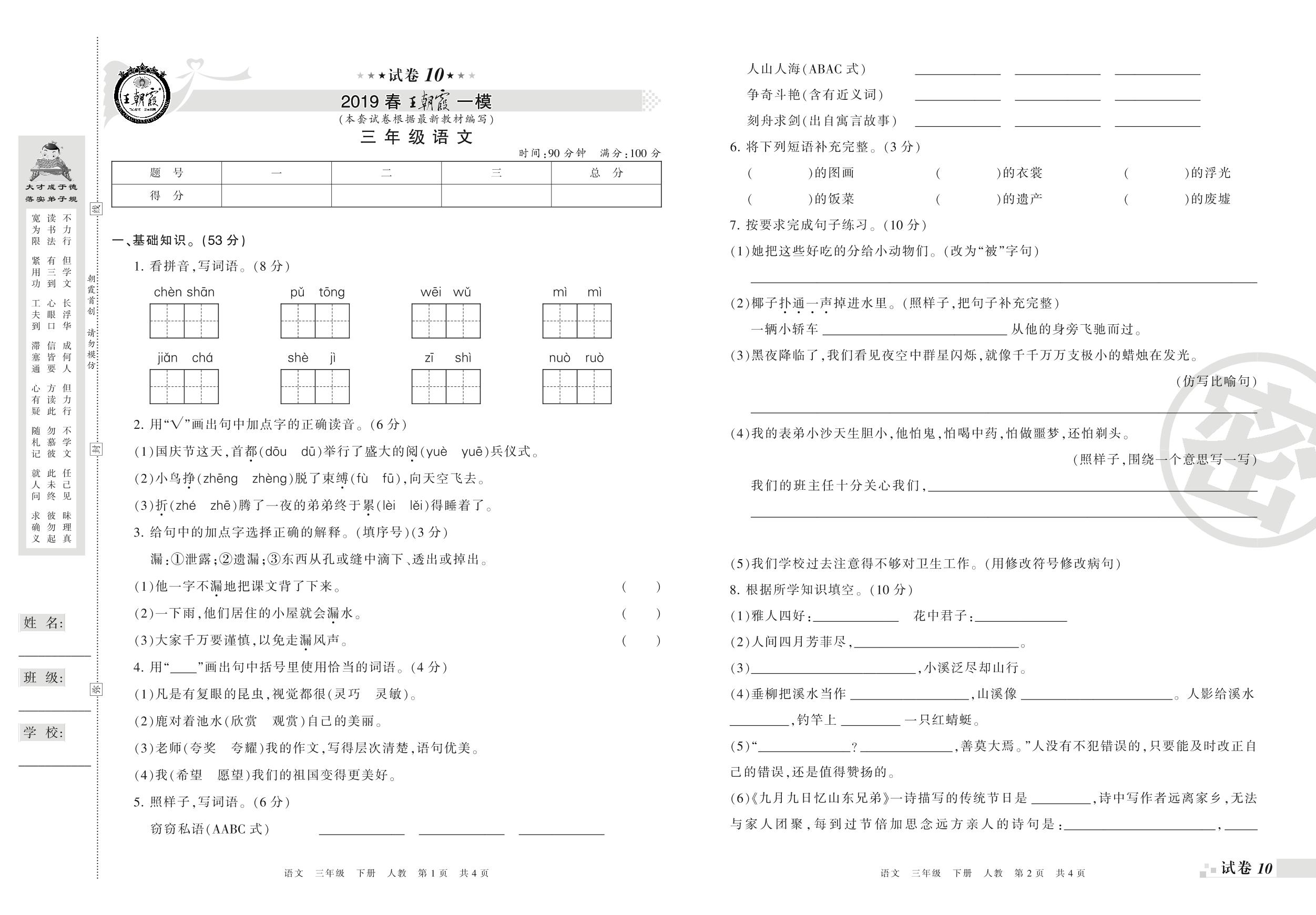 王朝霞期末模拟卷三年级下册语文(人教版)_R21080192450【10】