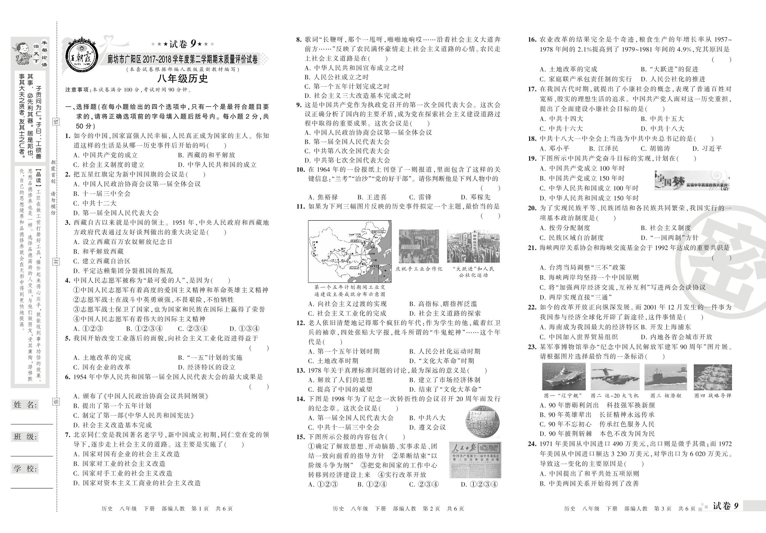 2017-2018学年第二学期廊坊市广阳区八年级历史试卷(人教版)【9】