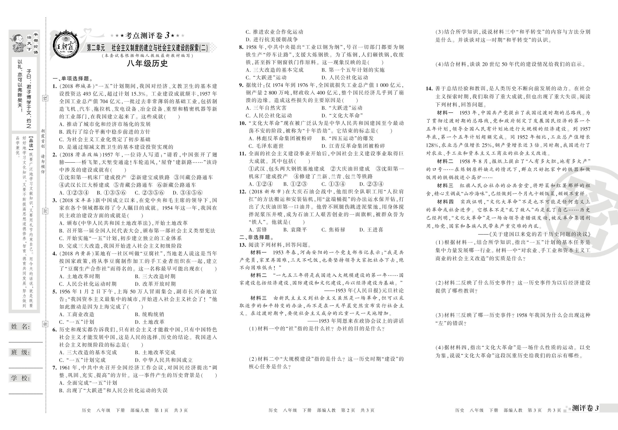 王朝霞期末测评卷——第二单元 社会主义制度的建立与社会主义建设的探索(二)、第三单元 中国特色社会主义道路(一)八年级下册历史(人教版)_R210810121320【0】