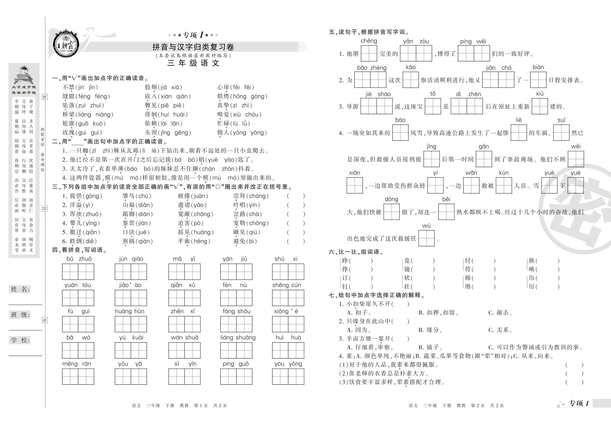王朝霞期末专项卷——拼音与汉字、词语归类复习三年级下册语文(冀教版)【0】