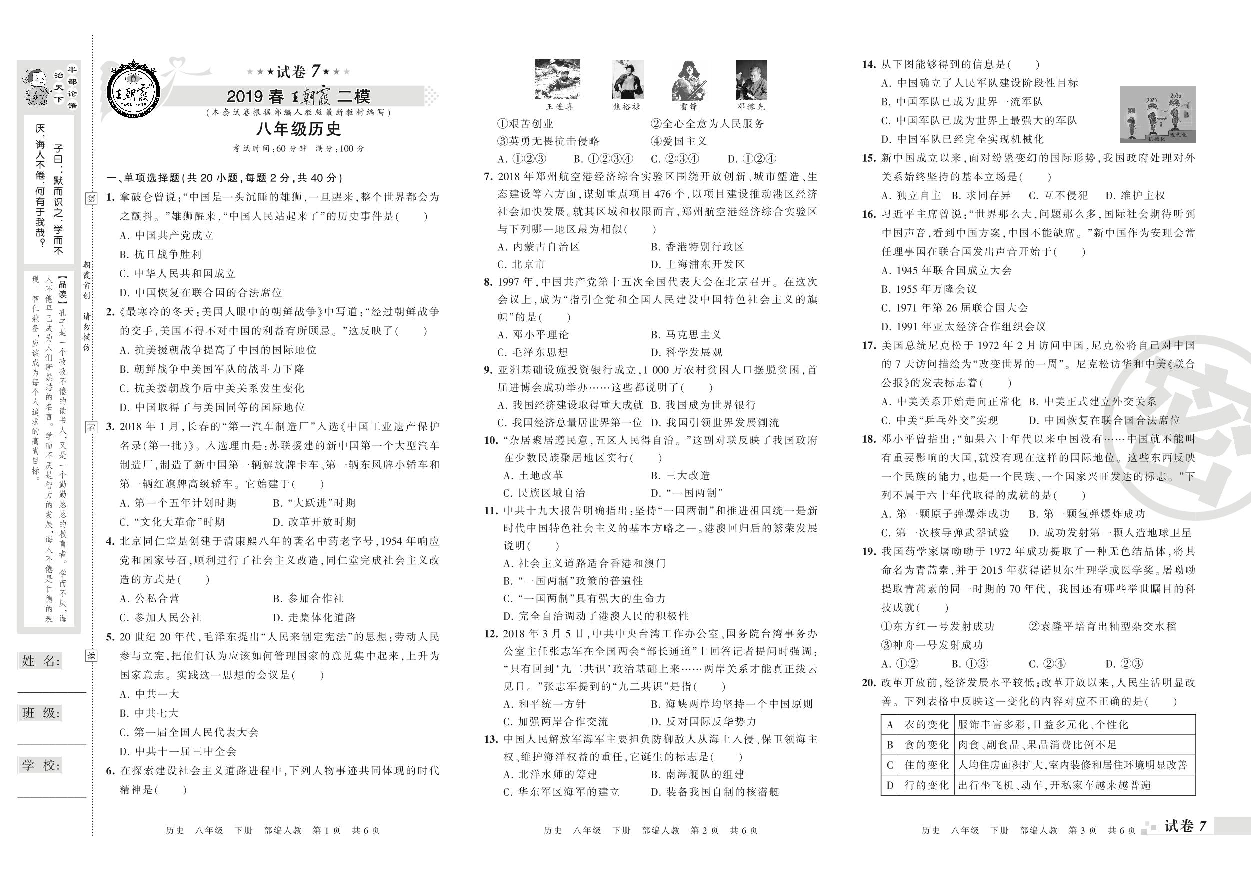 王朝霞期末模拟卷八年级下册历史(人教版)【7】
