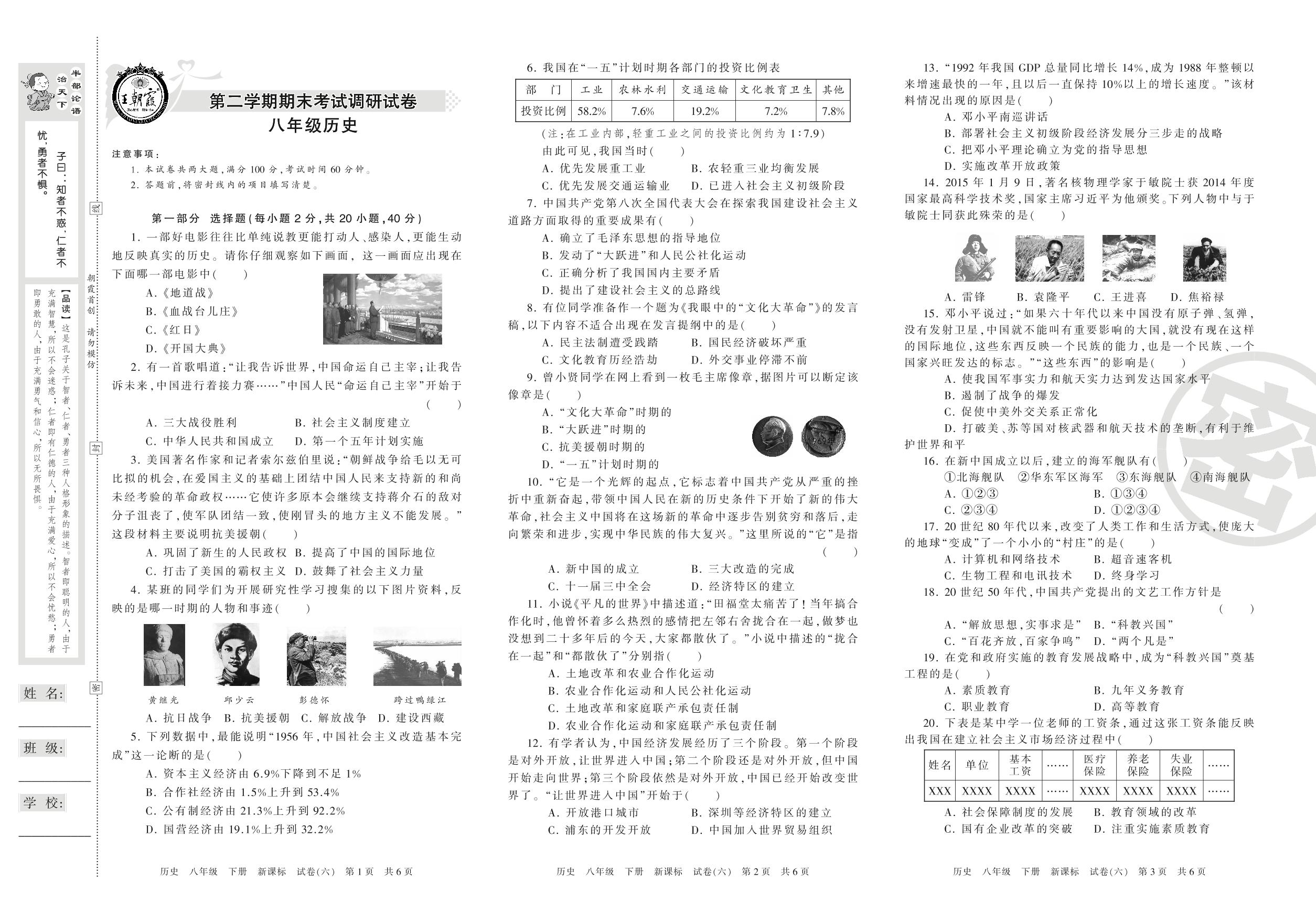 王朝霞期末调研卷八年级下册历史(新课版)【6】
