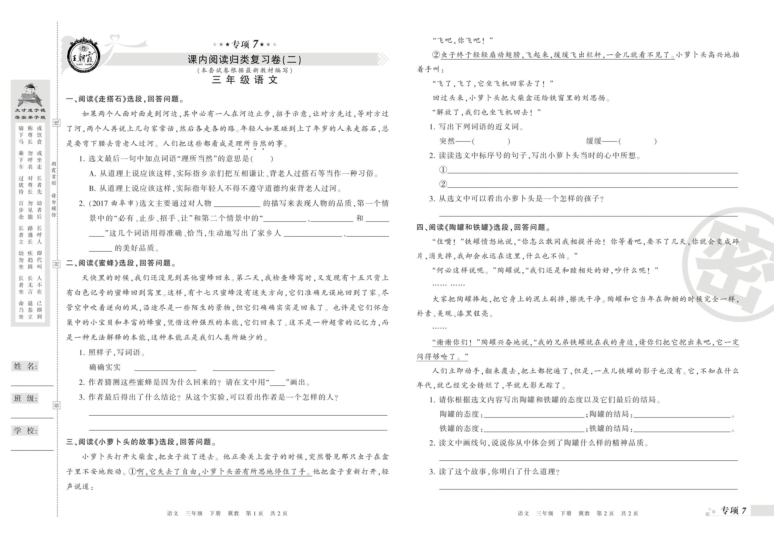 王朝霞期末专项卷——课内阅读、课外阅读与写作归类复习三年级下册语文(冀教版)【0】