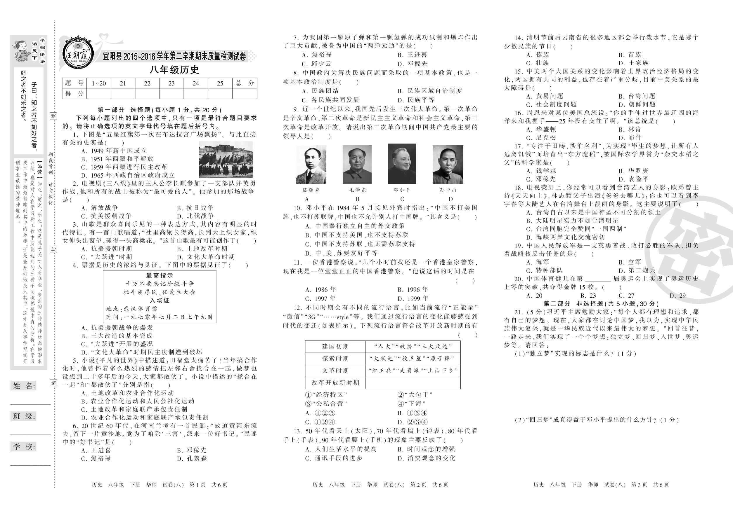 2015-2016学年第二学期洛阳市宜阳县八年级历史试卷(华师版)【8】