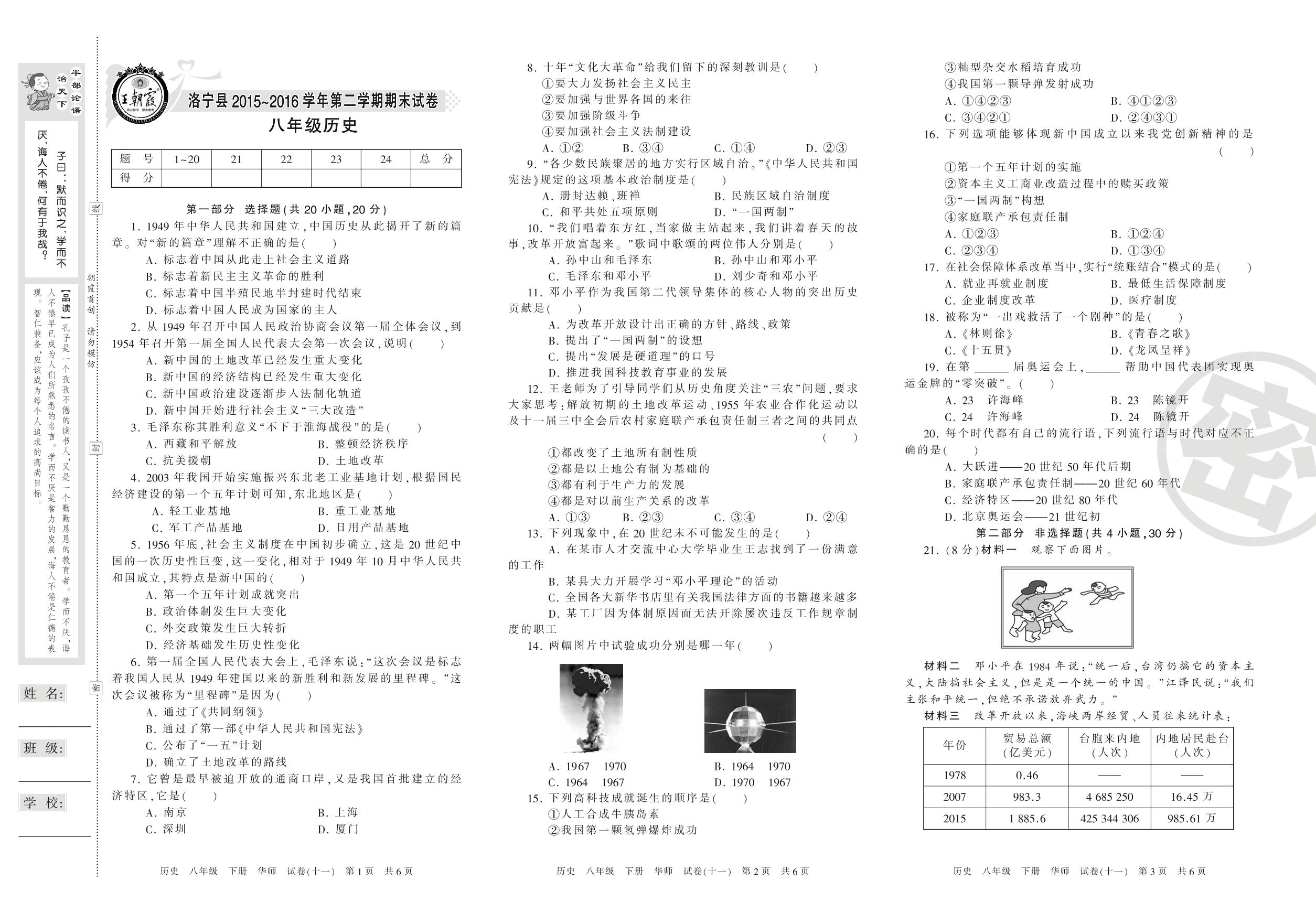 2015-2016学年第二学期洛阳市洛宁县八年级历史试卷(华师版)【11】