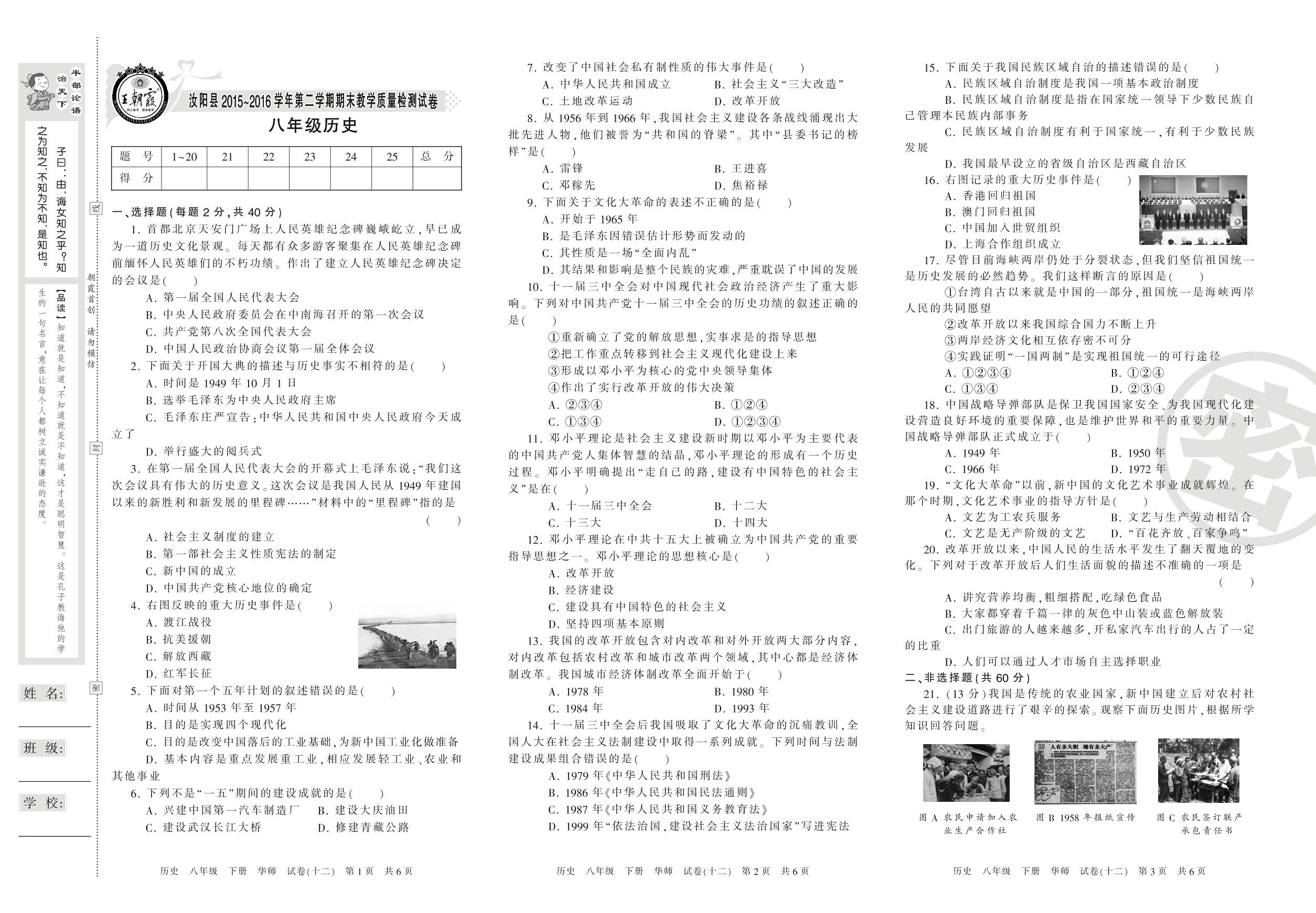 2015-2016学年第二学期洛阳市汝阳县八年级历史试卷(华师版)【12】