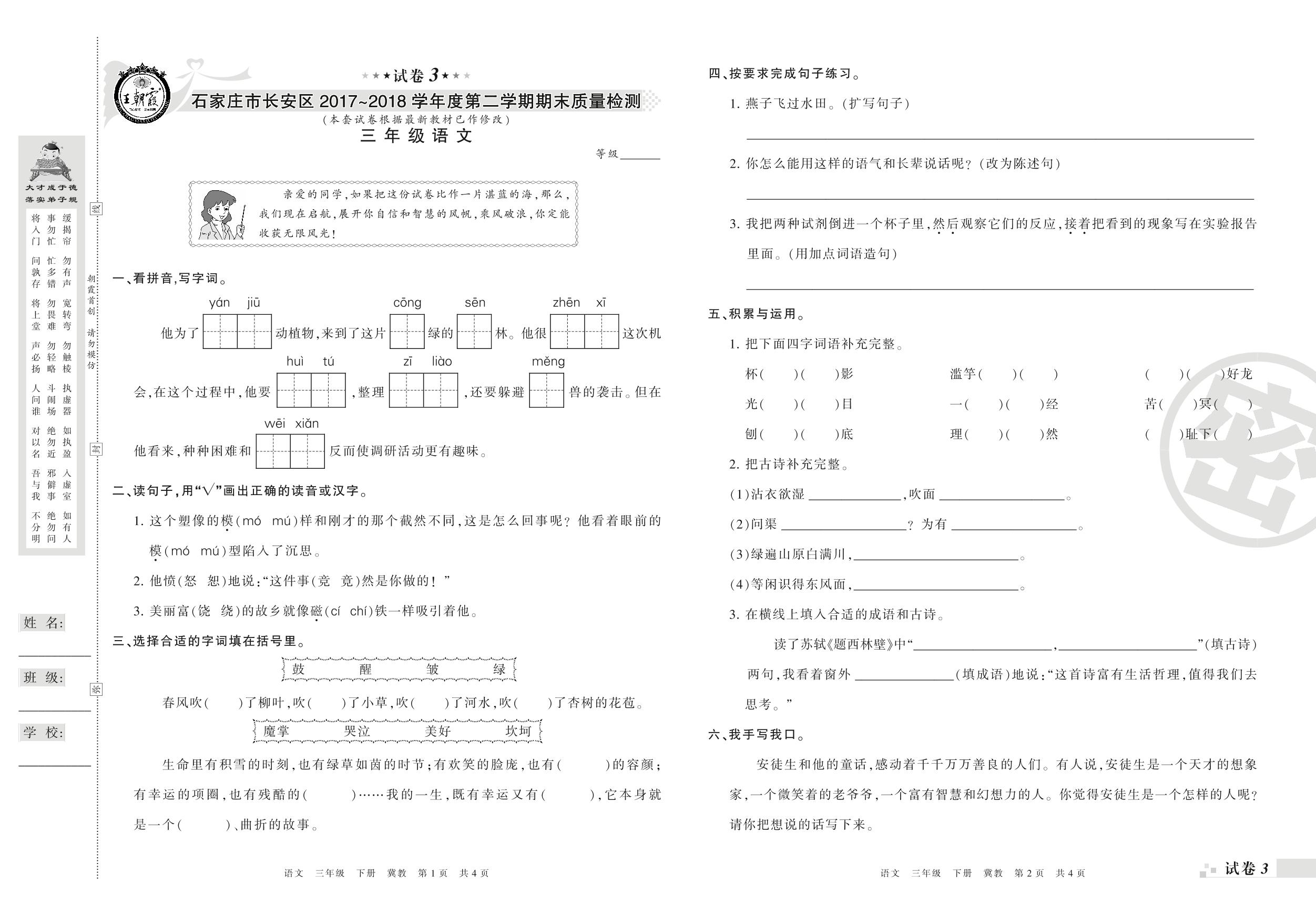 2017-2018学年第二学期石家庄市长安区三年级语文试卷(冀教版)【3】