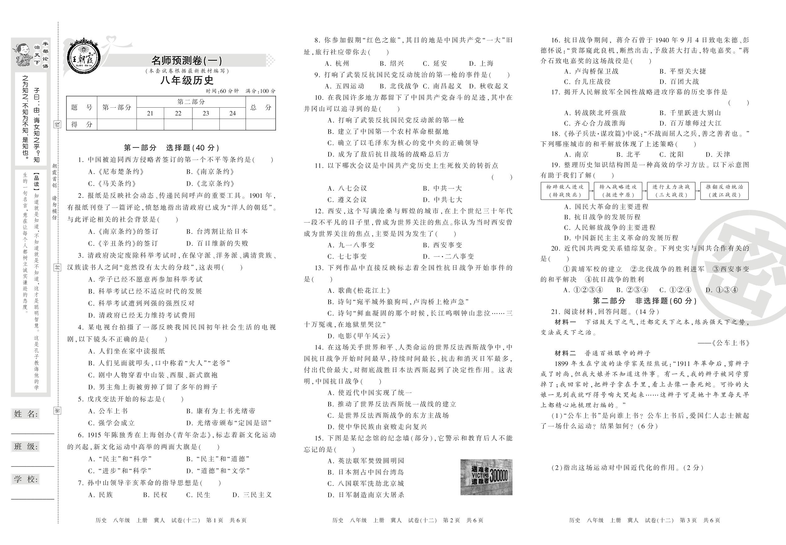 王朝霞名师期末预测卷八年级上册历史(冀人版)【12】