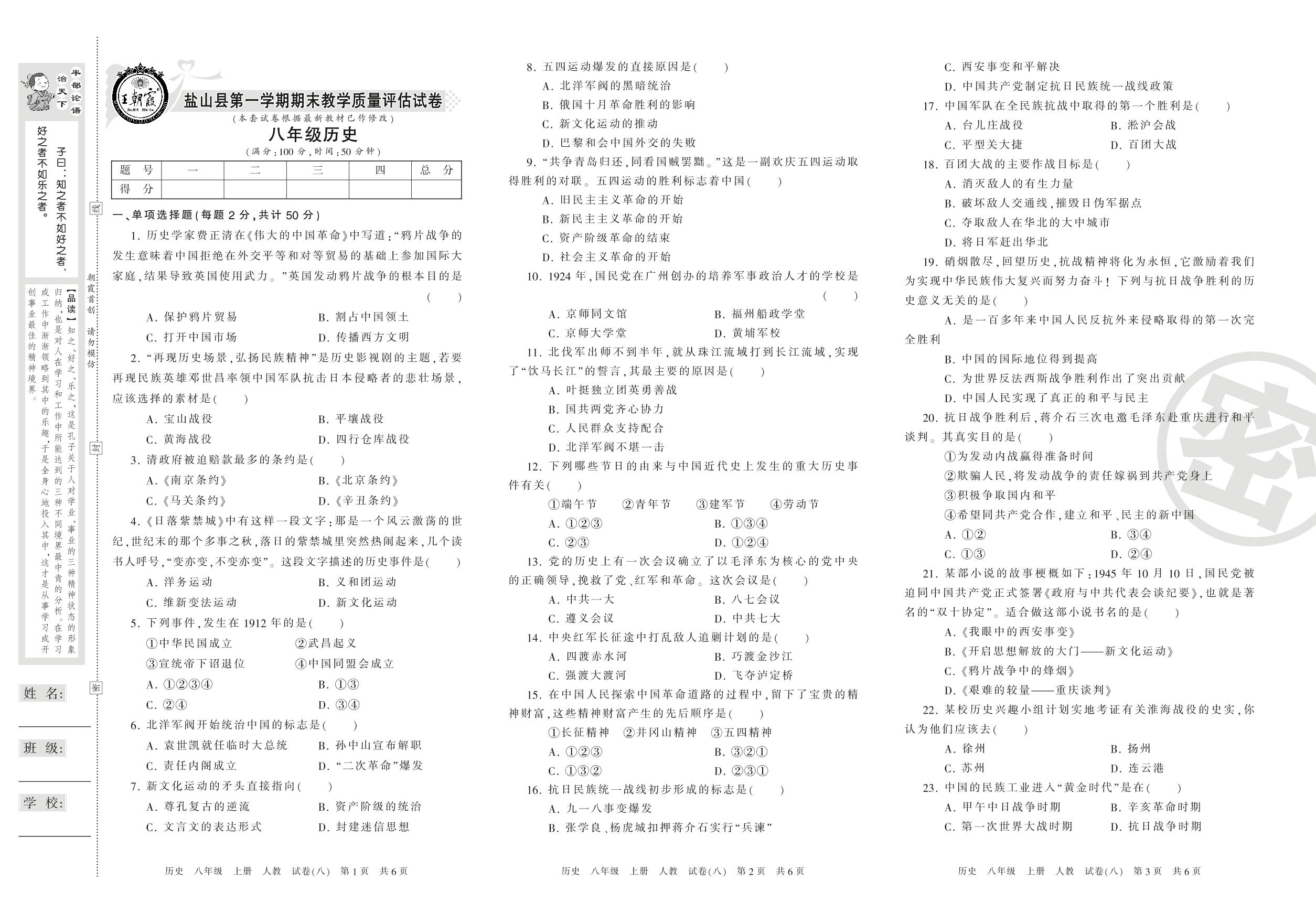 2016-2017学年第一学期沧州市河北卷盐山县八年级历史试卷(人教版)【8】