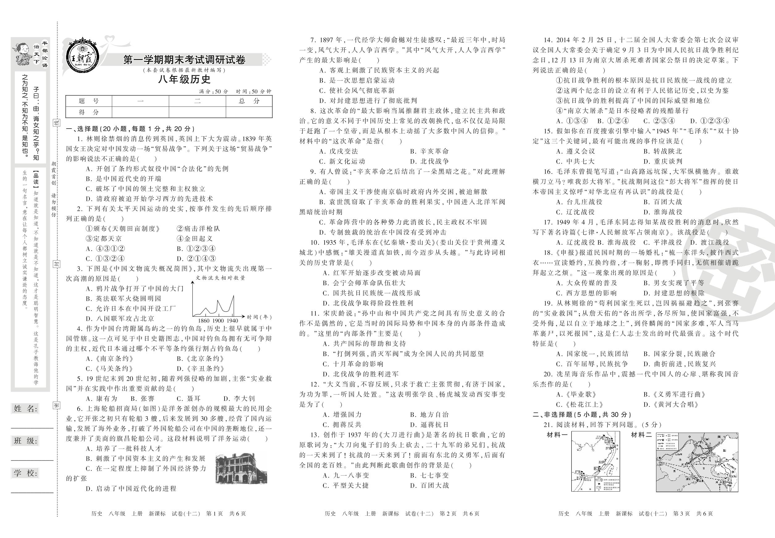 王朝霞期末调研卷八年级上册历史(新课版)【12】