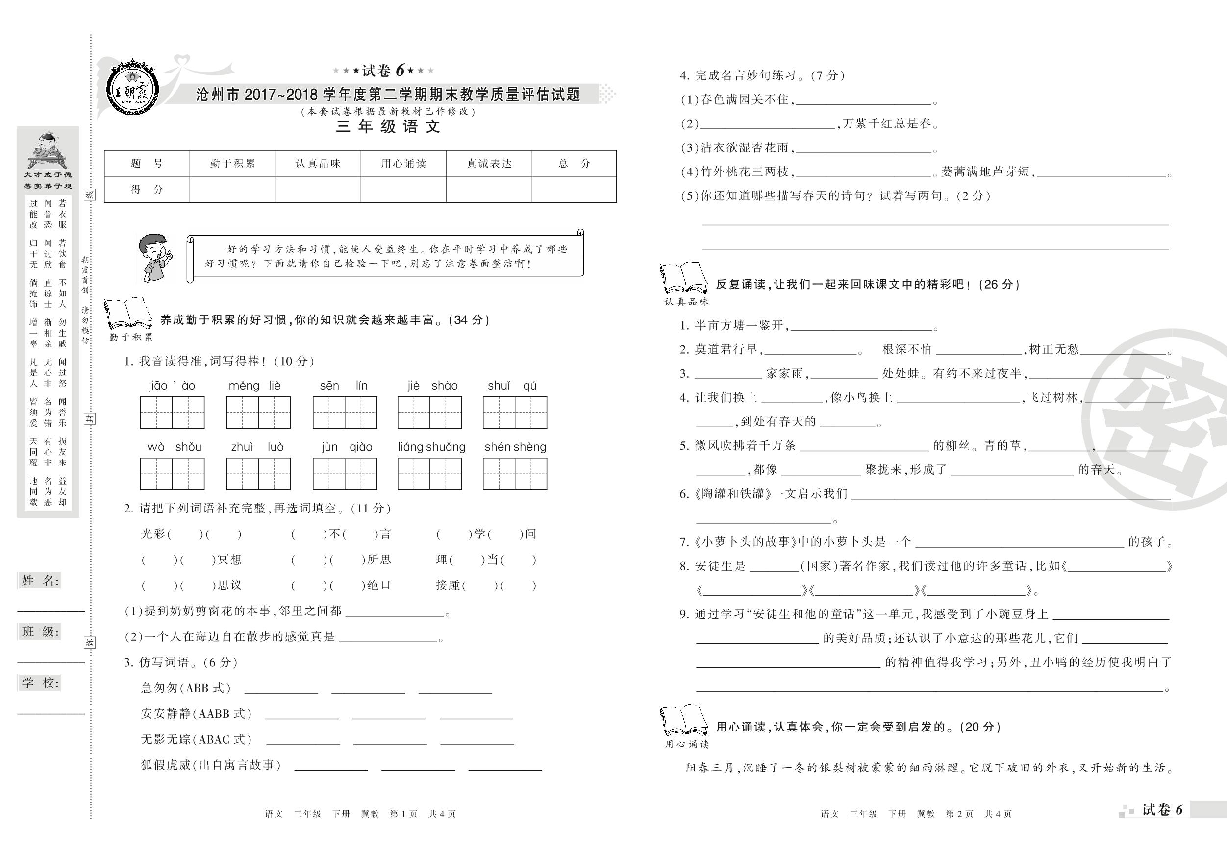 2017-2018学年第二学期沧州市三年级语文试卷(冀教版)【6】