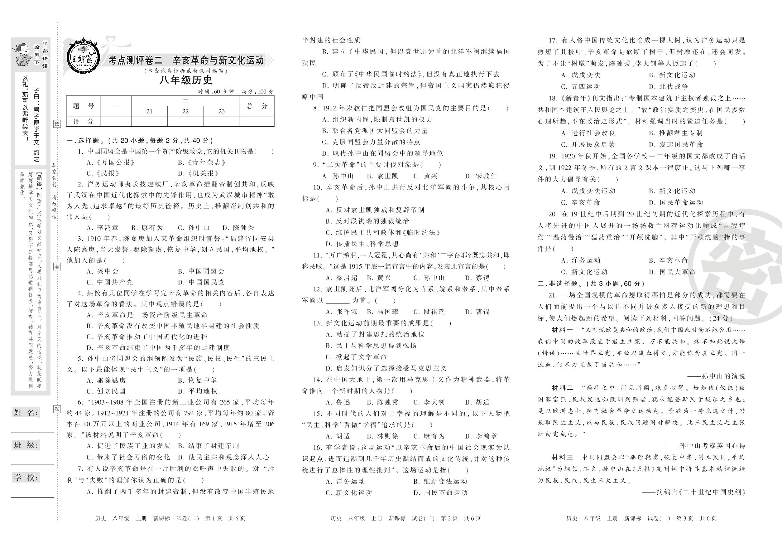 王朝霞期末测评卷八年级上册历史(新课版)【2】