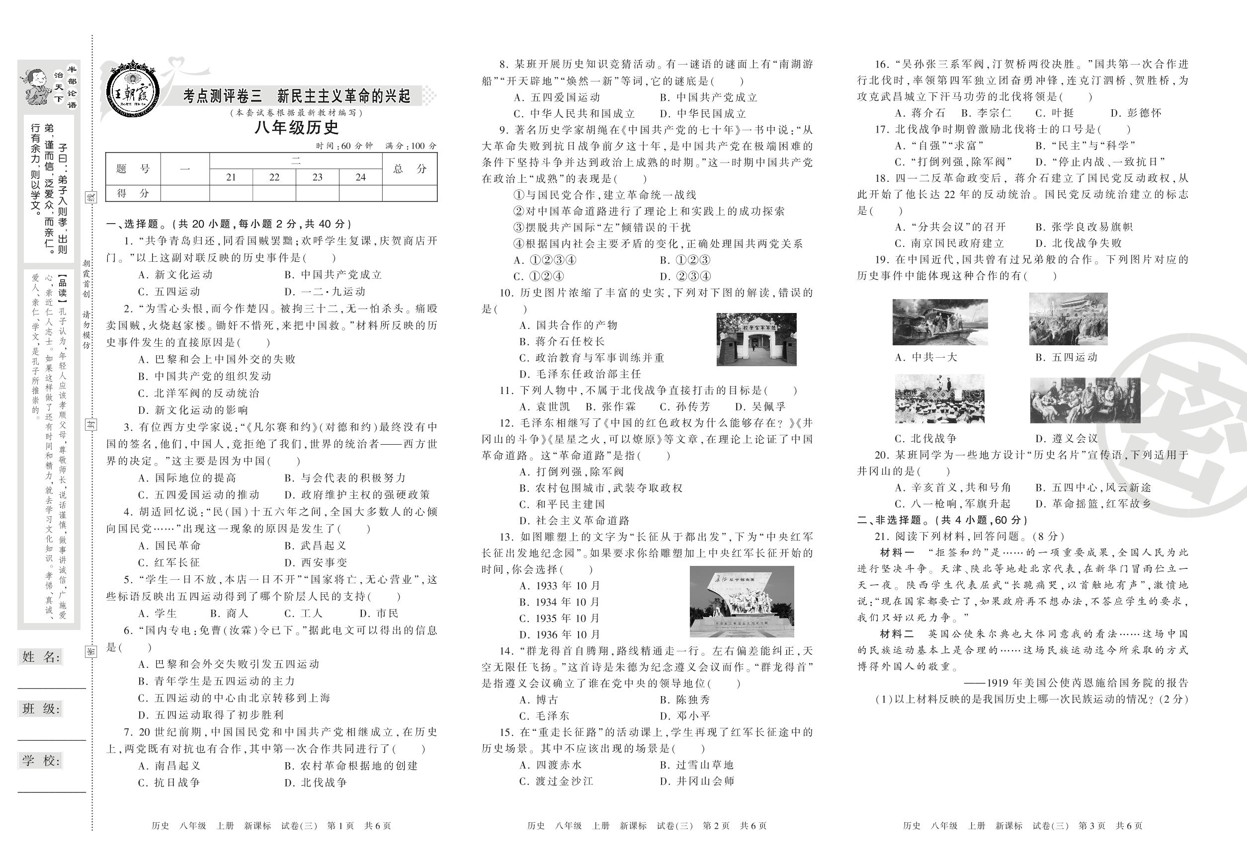 王朝霞期末测评卷八年级上册历史(新课版)【3】