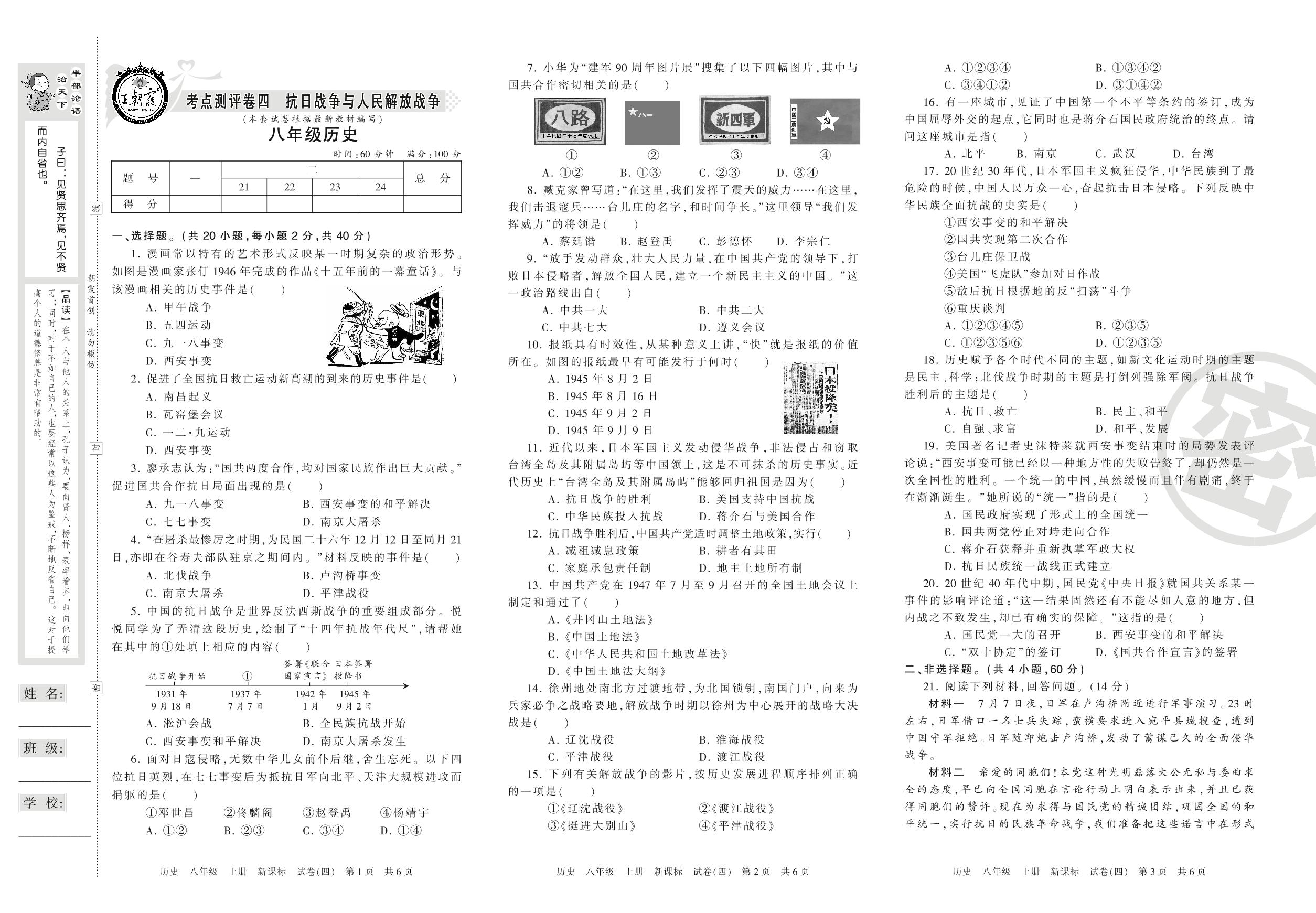 王朝霞期末测评卷八年级上册历史(新课版)【4】