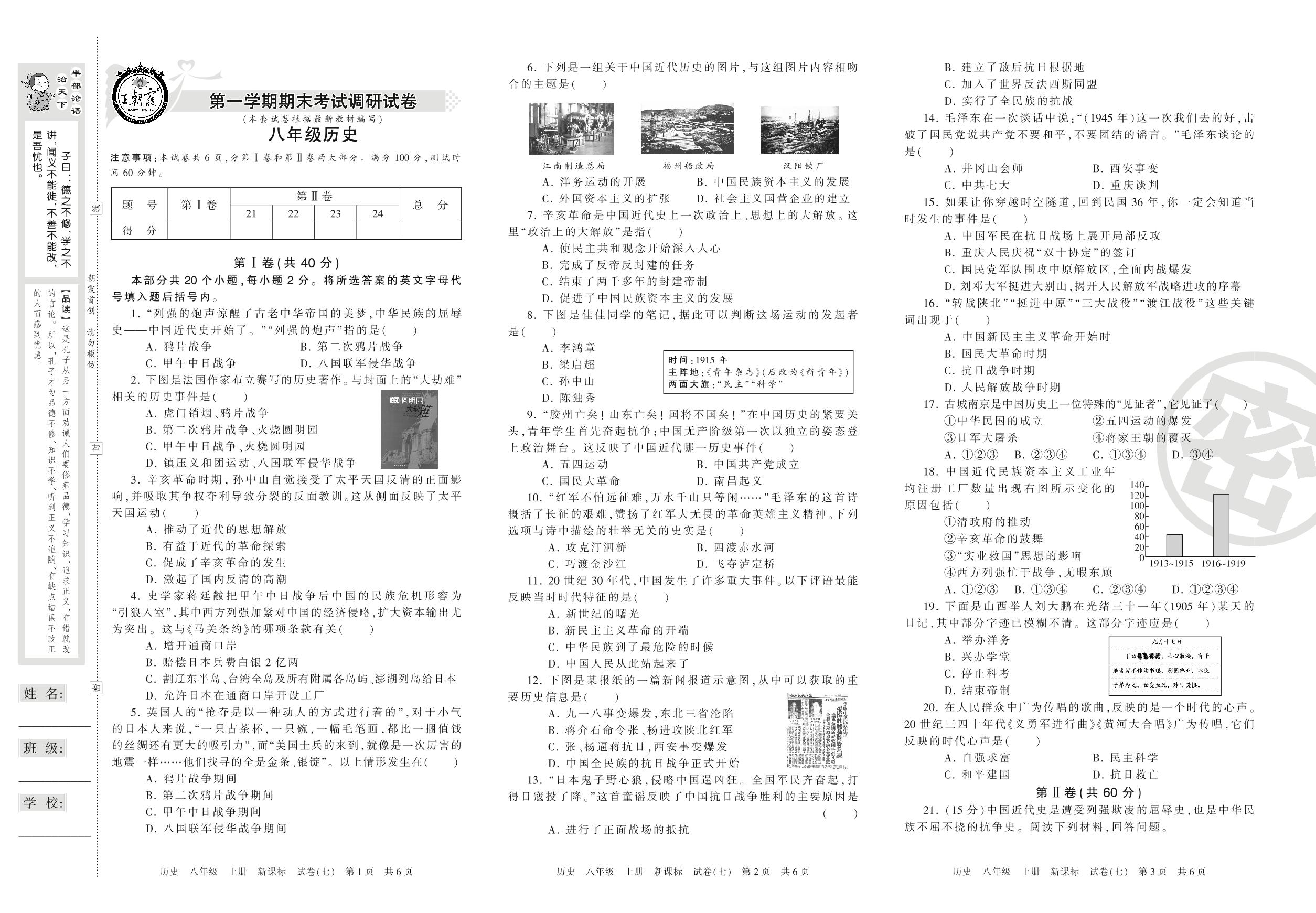 王朝霞期末调研卷八年级上册历史(新课版)【7】