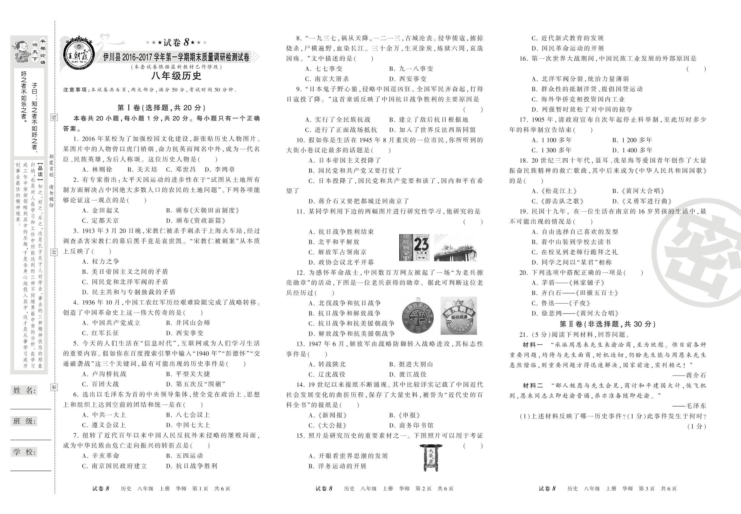 2016-2017学年第一学期洛阳市伊川县八年级历史试卷(华师版)【8】