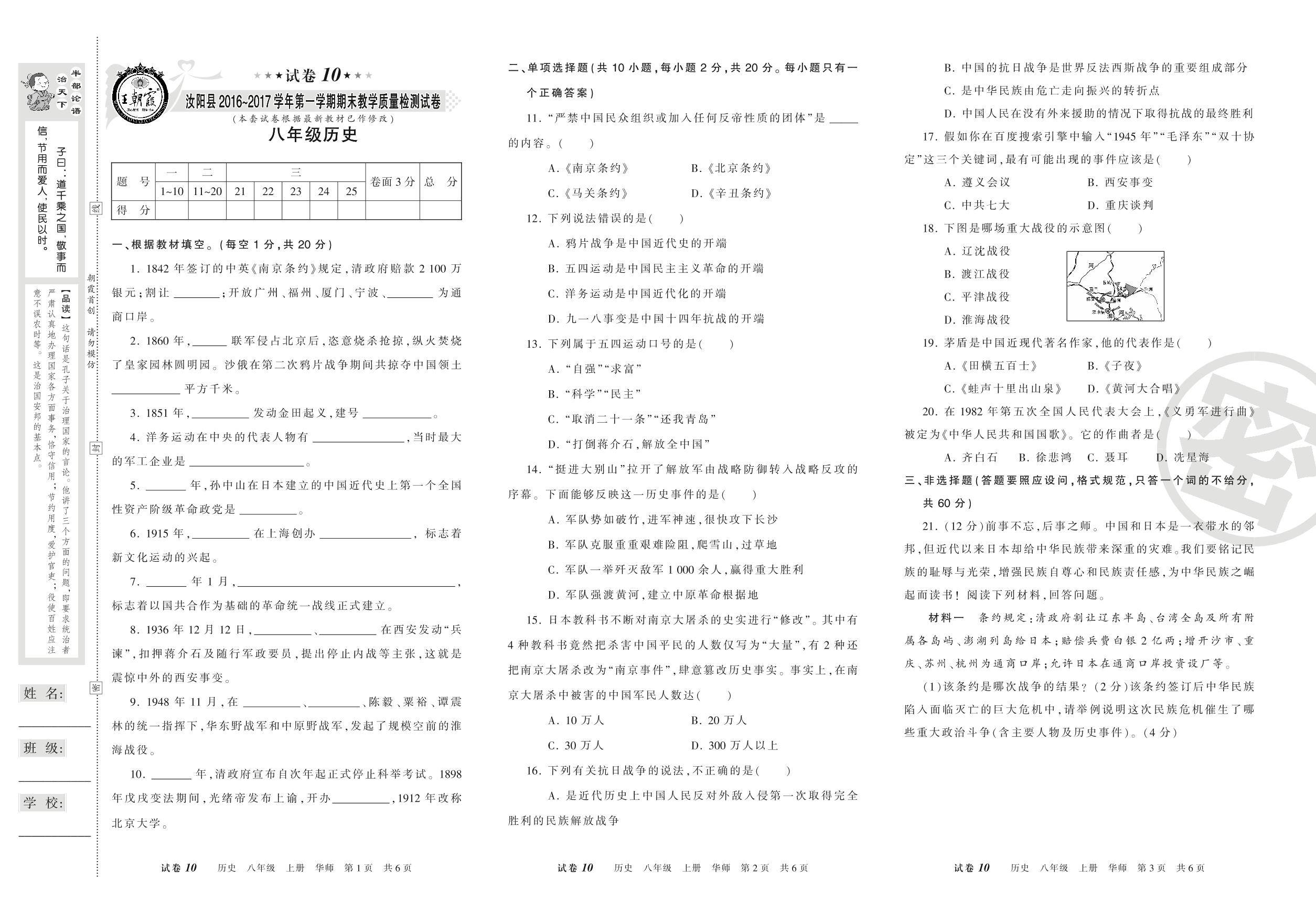 2016-2017学年第一学期洛阳市汝阳县八年级历史试卷(华师版)【10】
