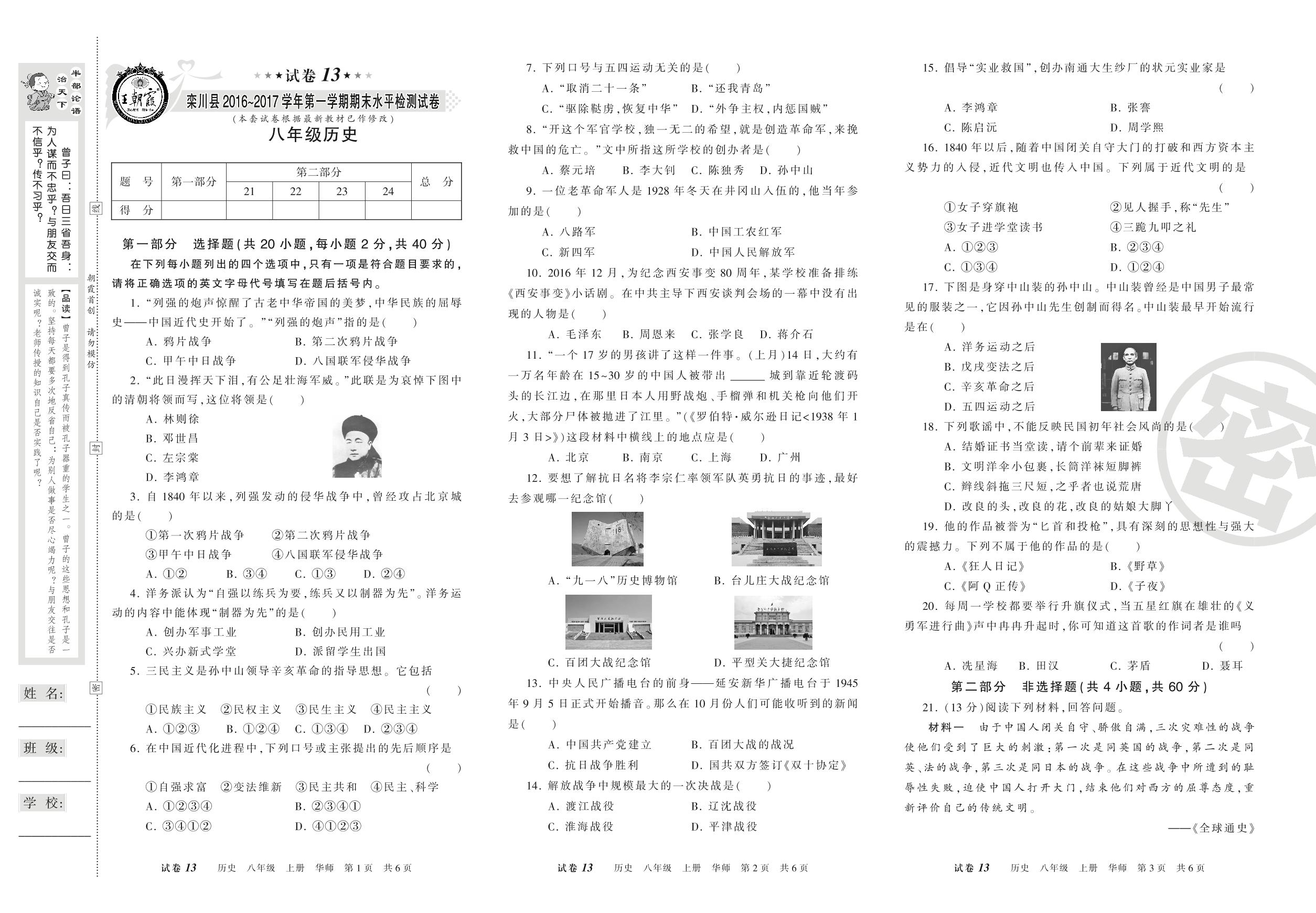 2016-2017学年第一学期洛阳市栾川县八年级历史试卷(华师版)【13】