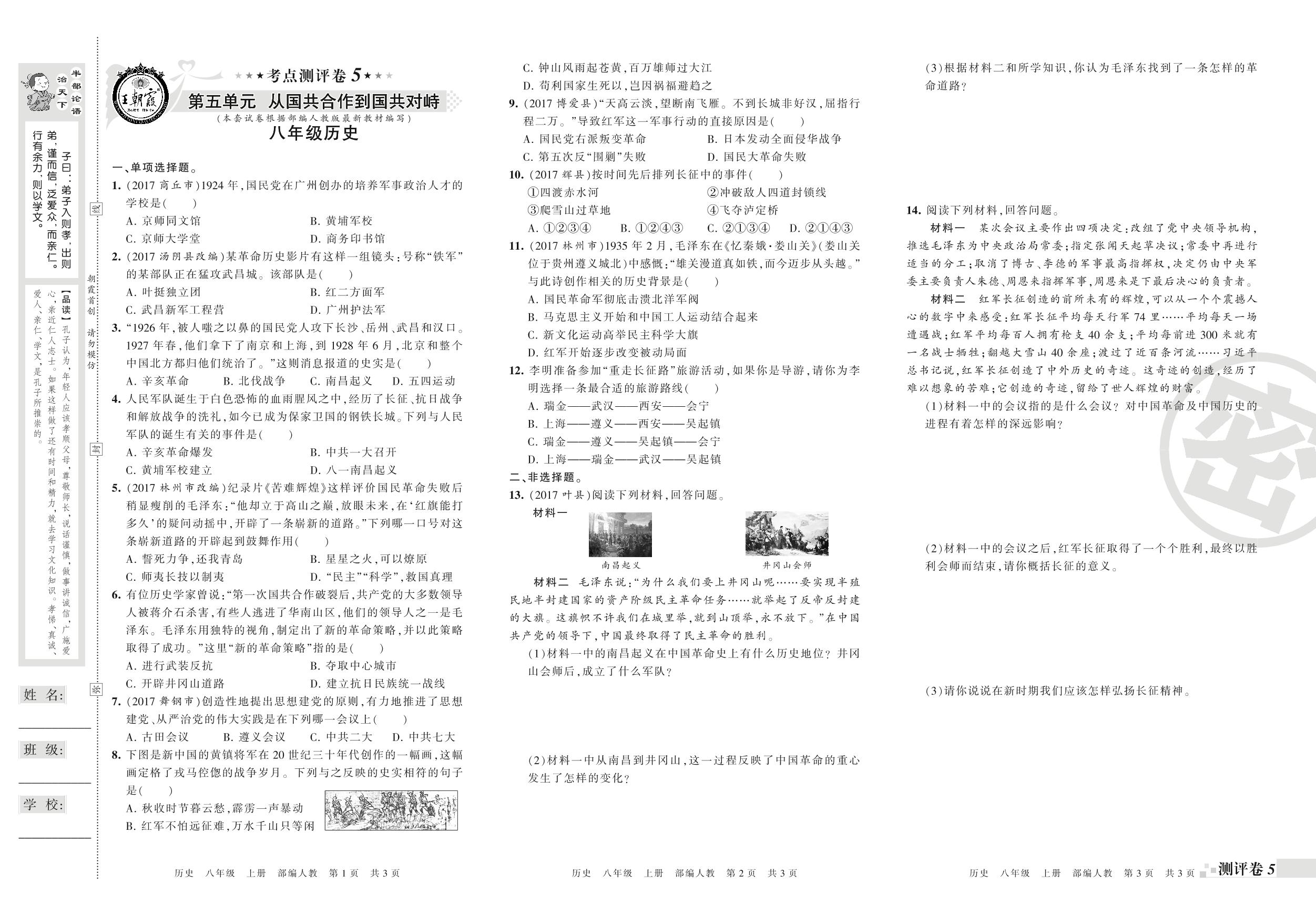 王朝霞期末测评卷——第五单元 从国共合作到国共对峙、第六单元 中华民族的抗日战争八年级上册历史(人教版)_R210810123302【0】