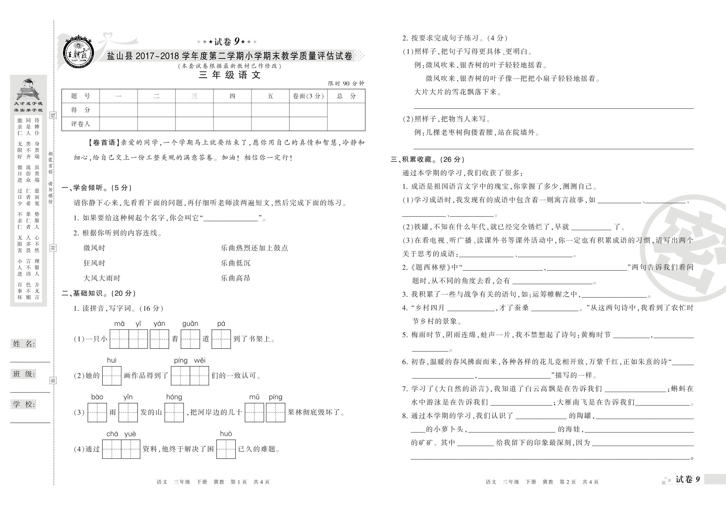 2017-2018学年第二学期沧州市盐山县三年级语文试卷(冀教版)【9】