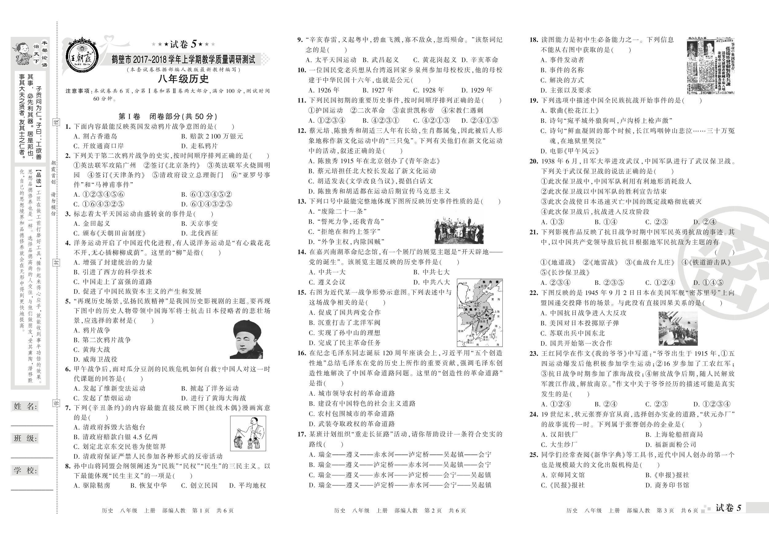 2017-2018学年第一学期鹤壁市八年级历史试卷(人教版)【5】