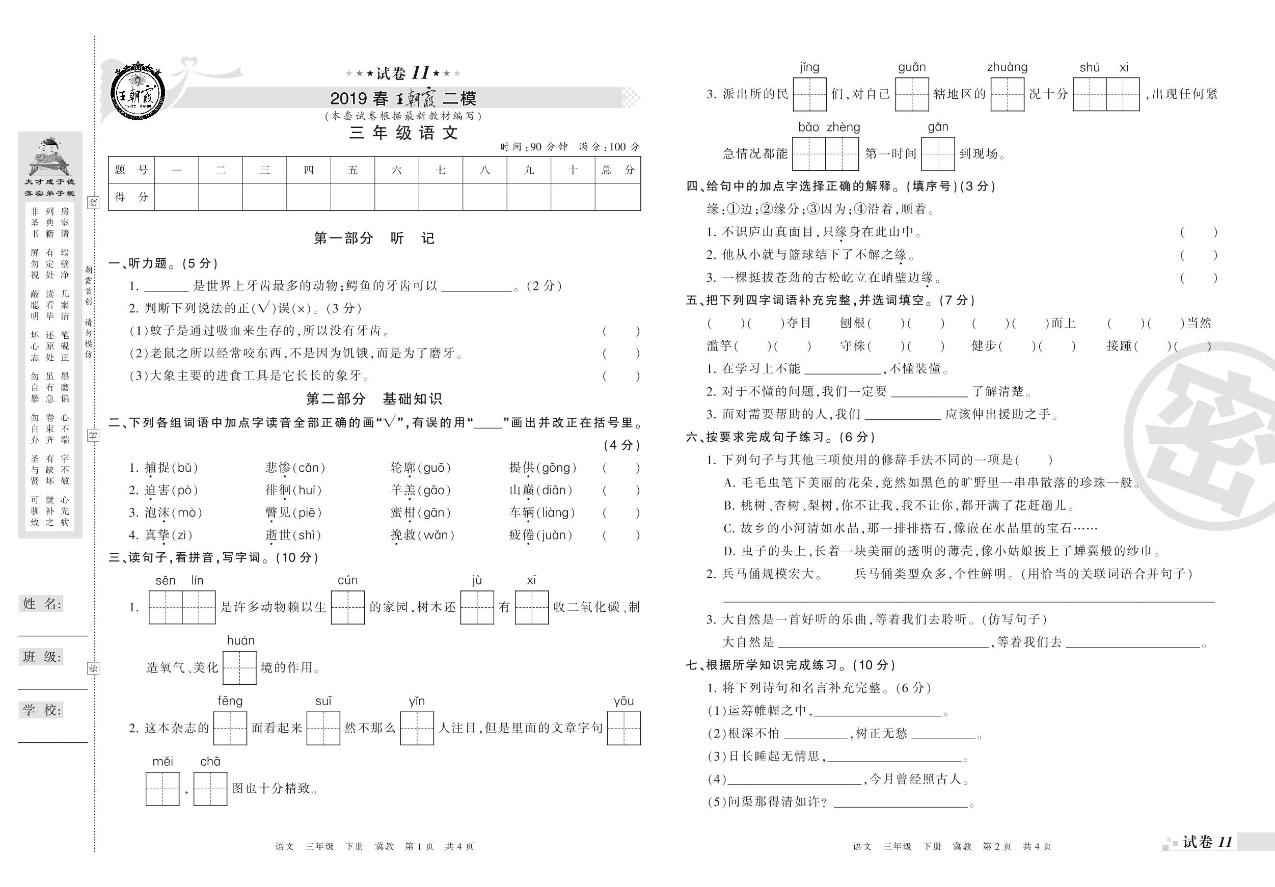 王朝霞期末模拟卷三年级下册语文(冀教版)【11】