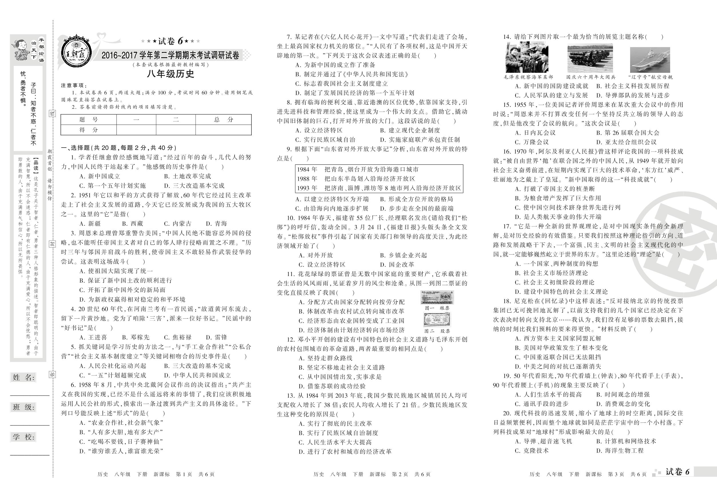 2016-2017学年第二学期期末考试调研试卷八年级历史(新课版)【6】