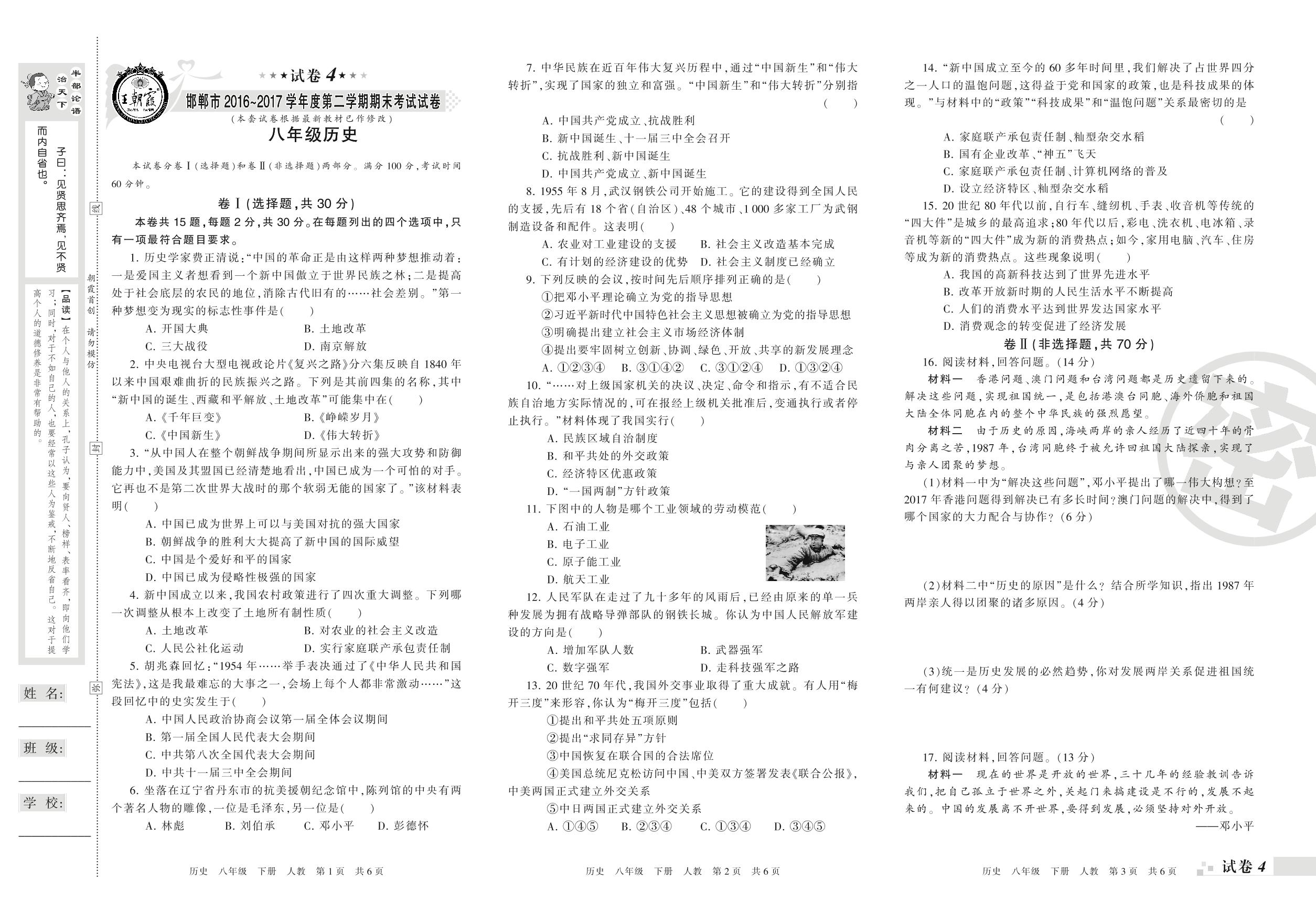 2016-2017学年第二学期邯郸市八年级历史试卷(人教版)【4】