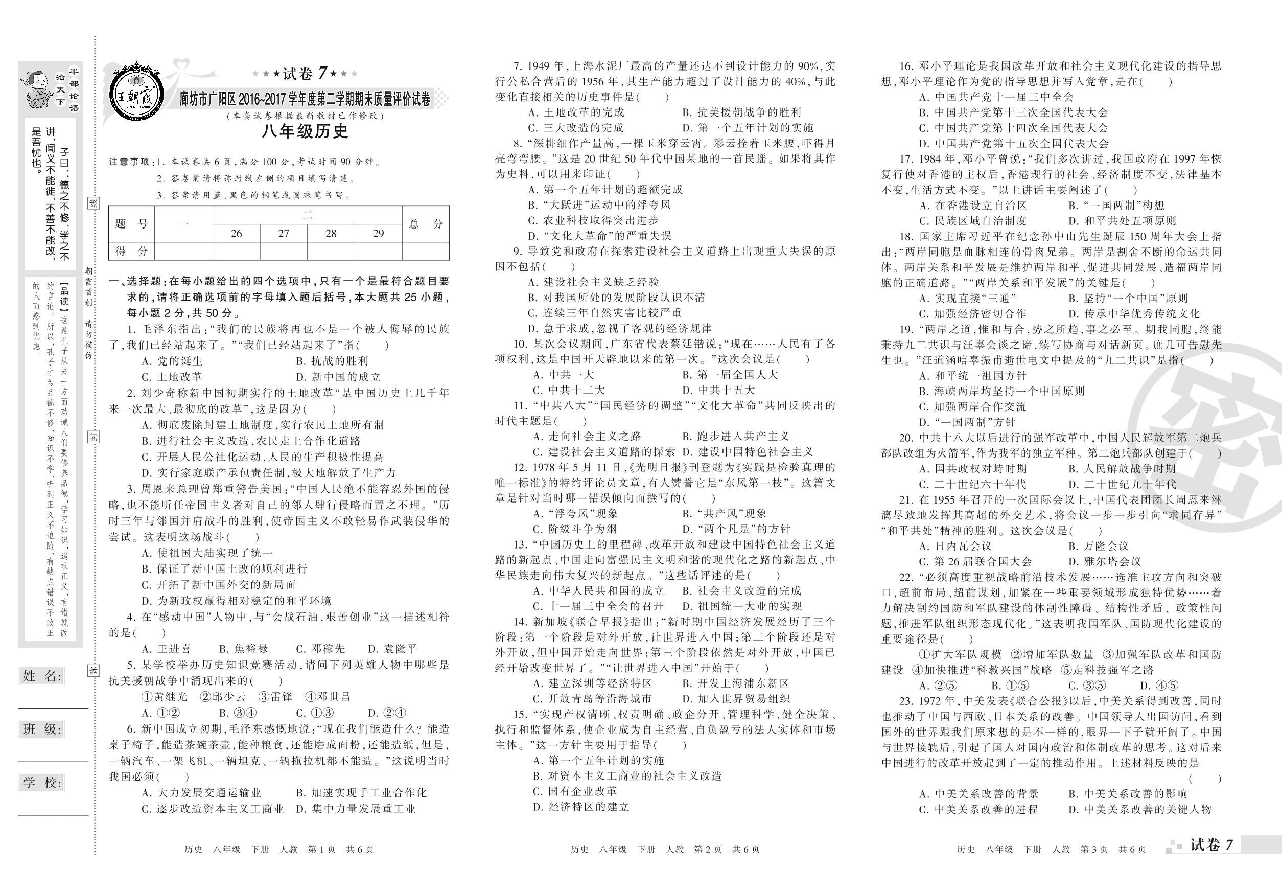 2016-2017学年第二学期廊坊市广阳区八年级历史试卷(人教版)【7】