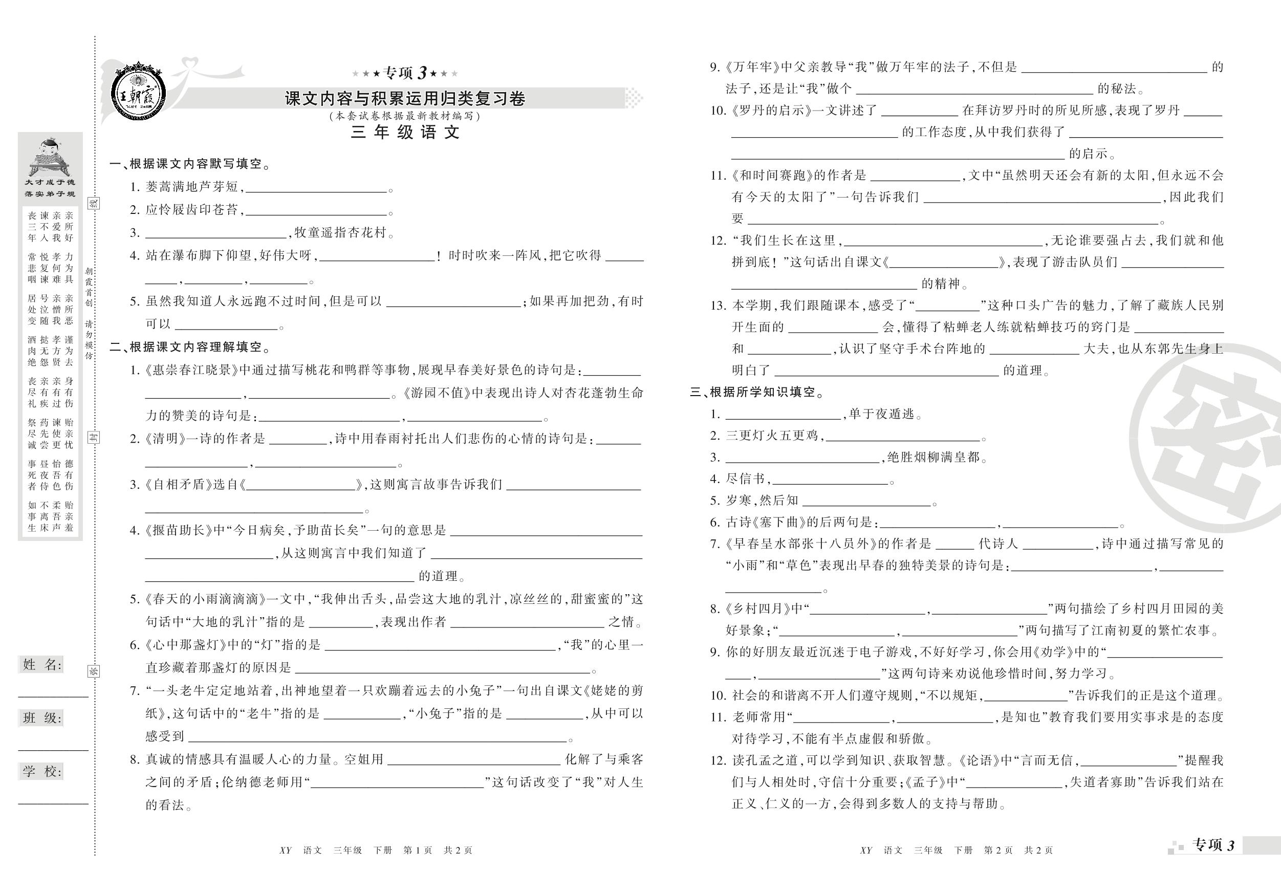 王朝霞期末专项卷——课文内容与积累运用、课内阅读与写作归类复习三年级下册语文(语文版)_R21080192604【0】