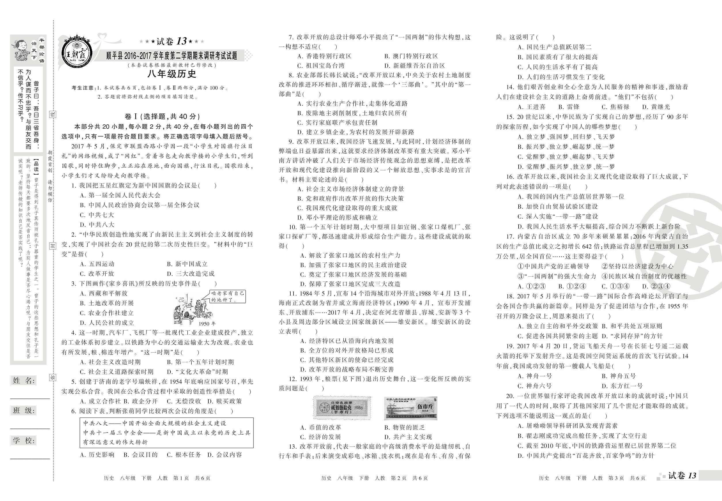 2016-2017学年第二学期保定市顺平县八年级历史试卷(人教版)【13】