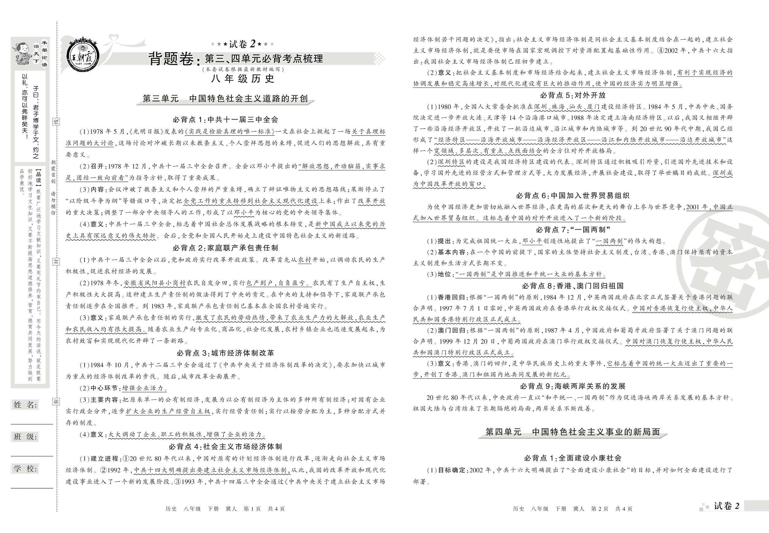 王朝霞期末背题卷——第三、四单元必背考点梳理八年级下册历史(冀人版)【2】