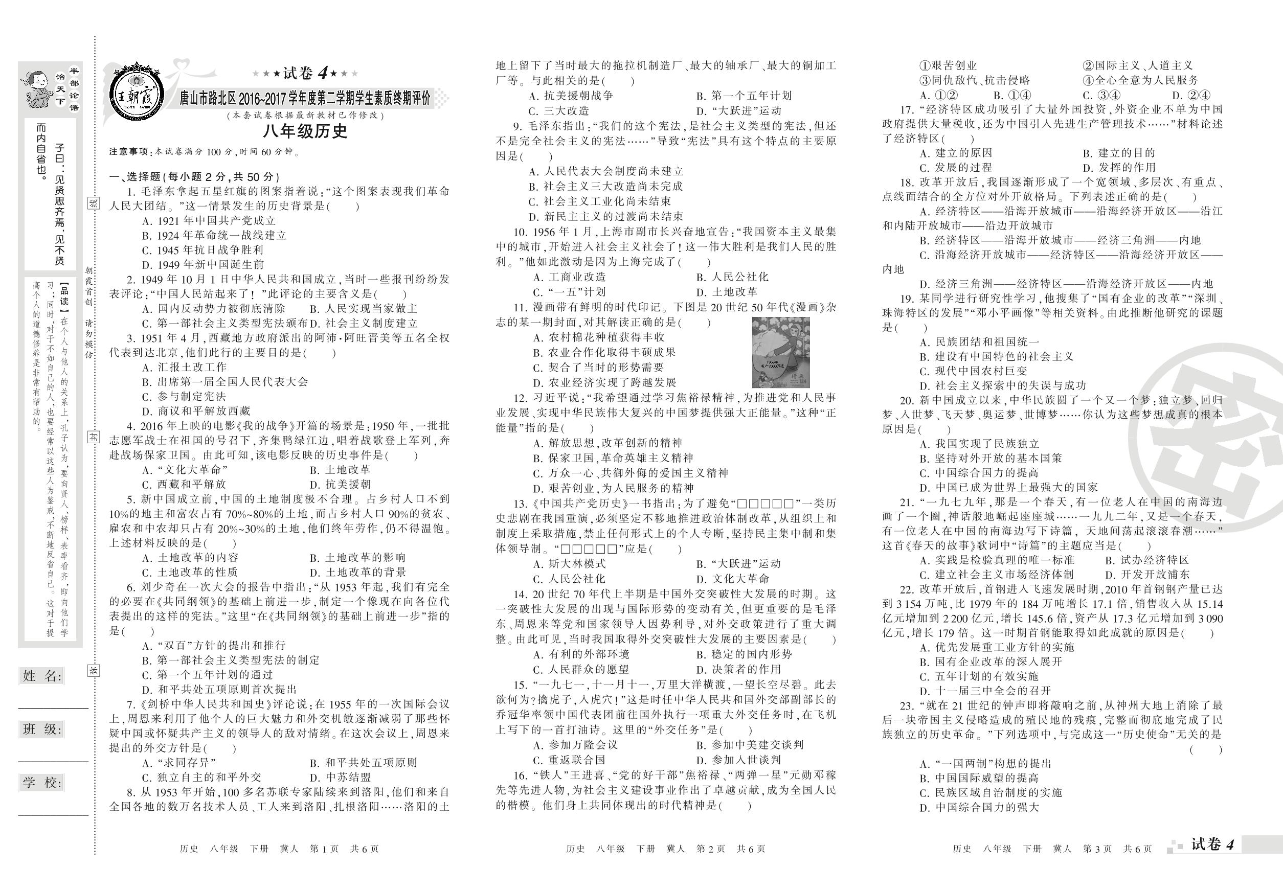 2016-2017学年第二学期唐山市路北区八年级历史试卷(冀人版)【4】