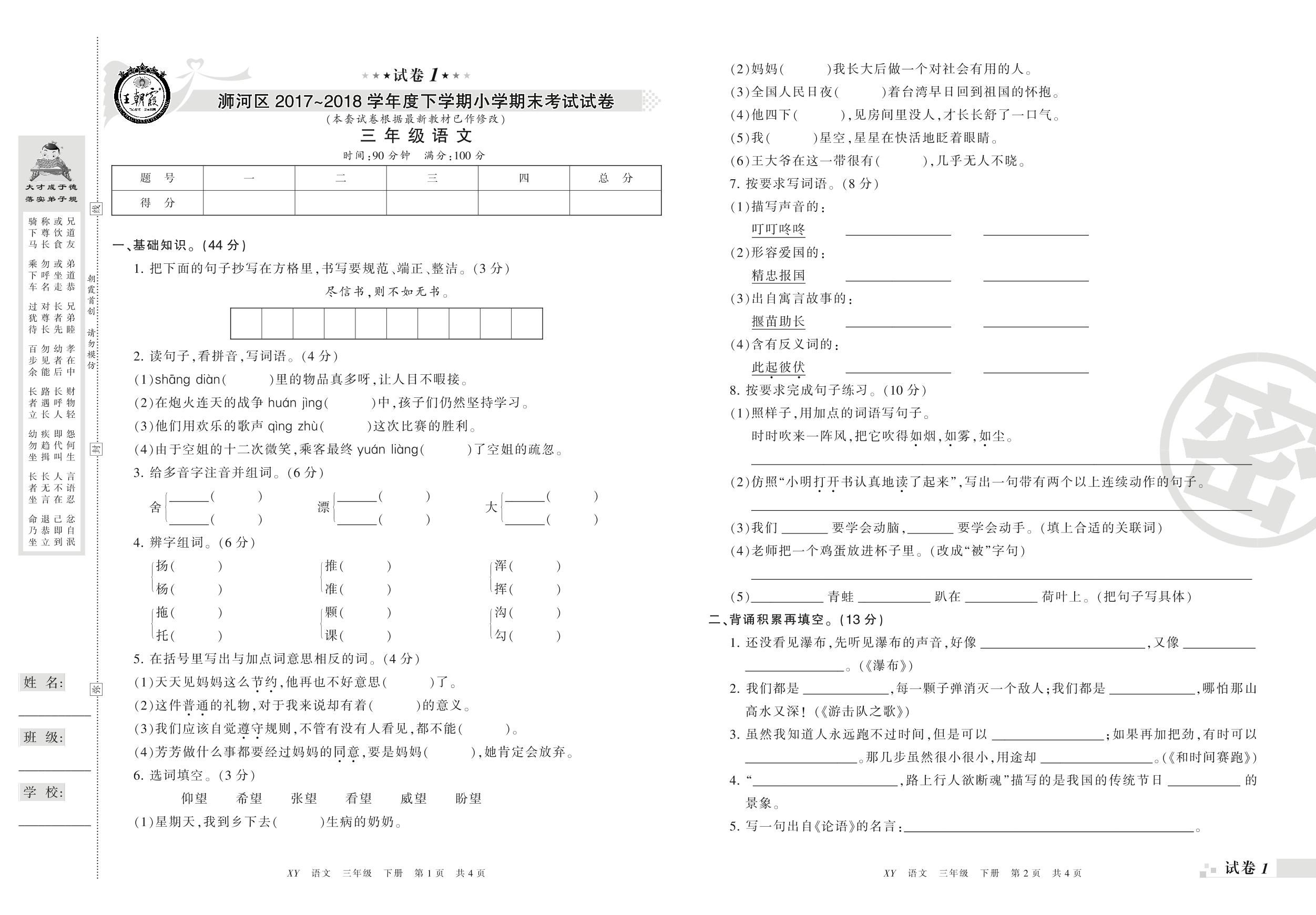 2017-2018学年第二学期信阳市浉河区三年级语文试卷(语文版)【1】