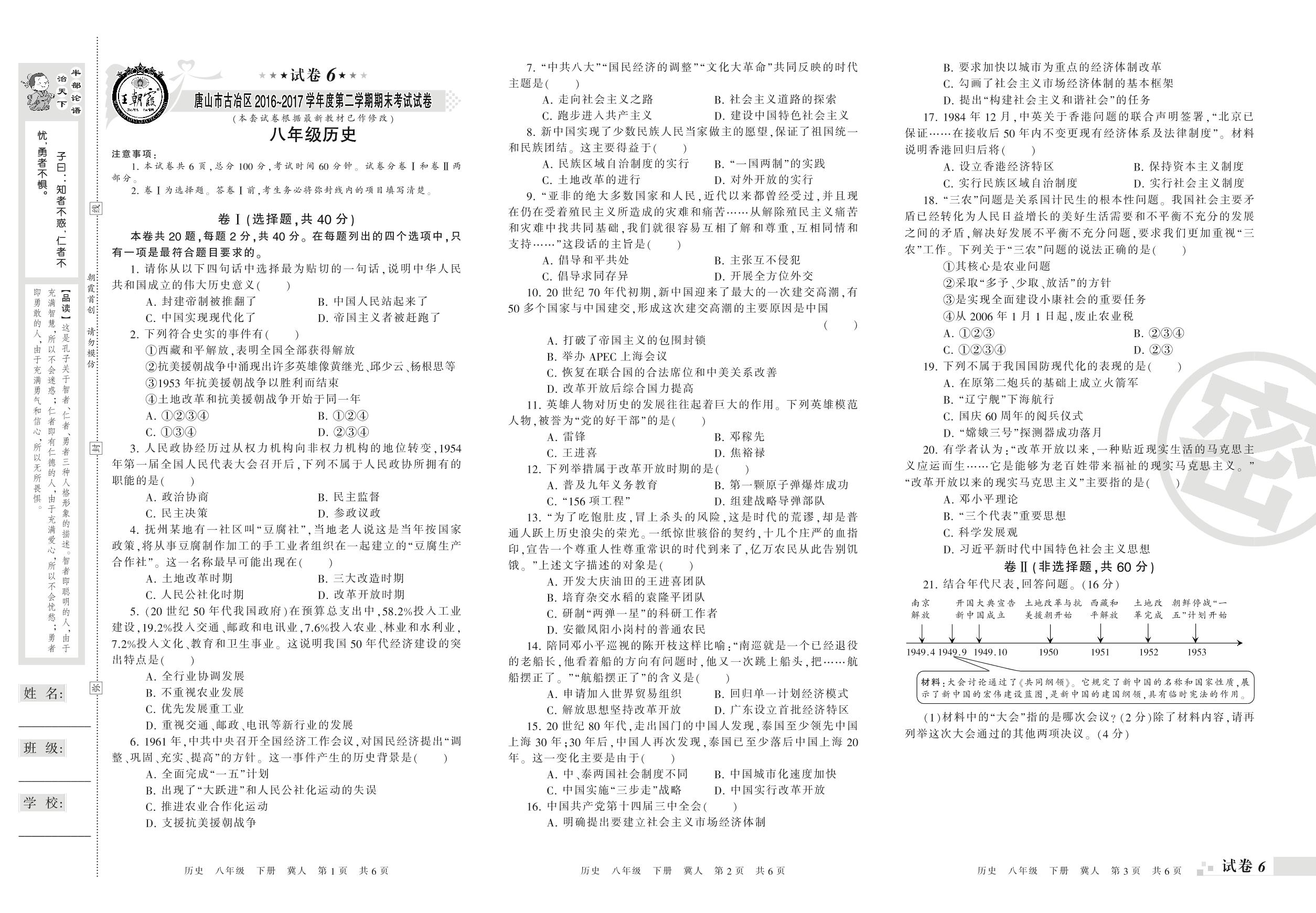 2016-2017学年第二学期唐山市古冶区八年级历史试卷(冀人版)【6】