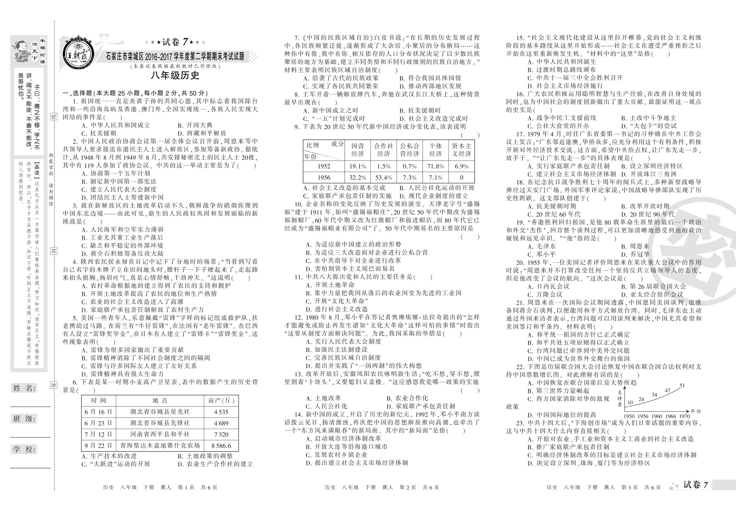 2016-2017学年第二学期石家庄市栾城区八年级历史试卷(冀人版)【7】