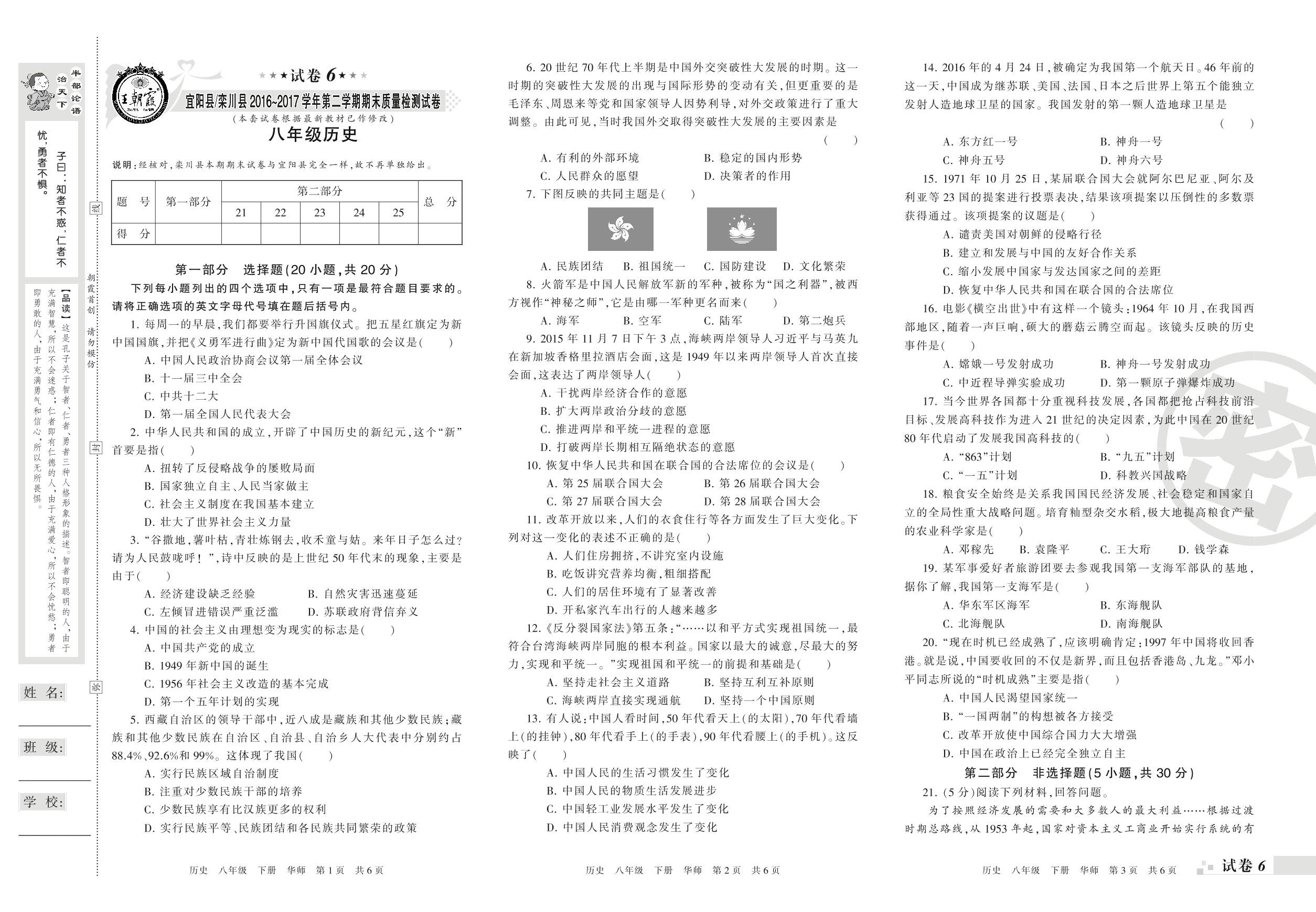 2016-2017学年第二学期洛阳市宜阳县、栾川县八年级历史试卷(华师版)【6】