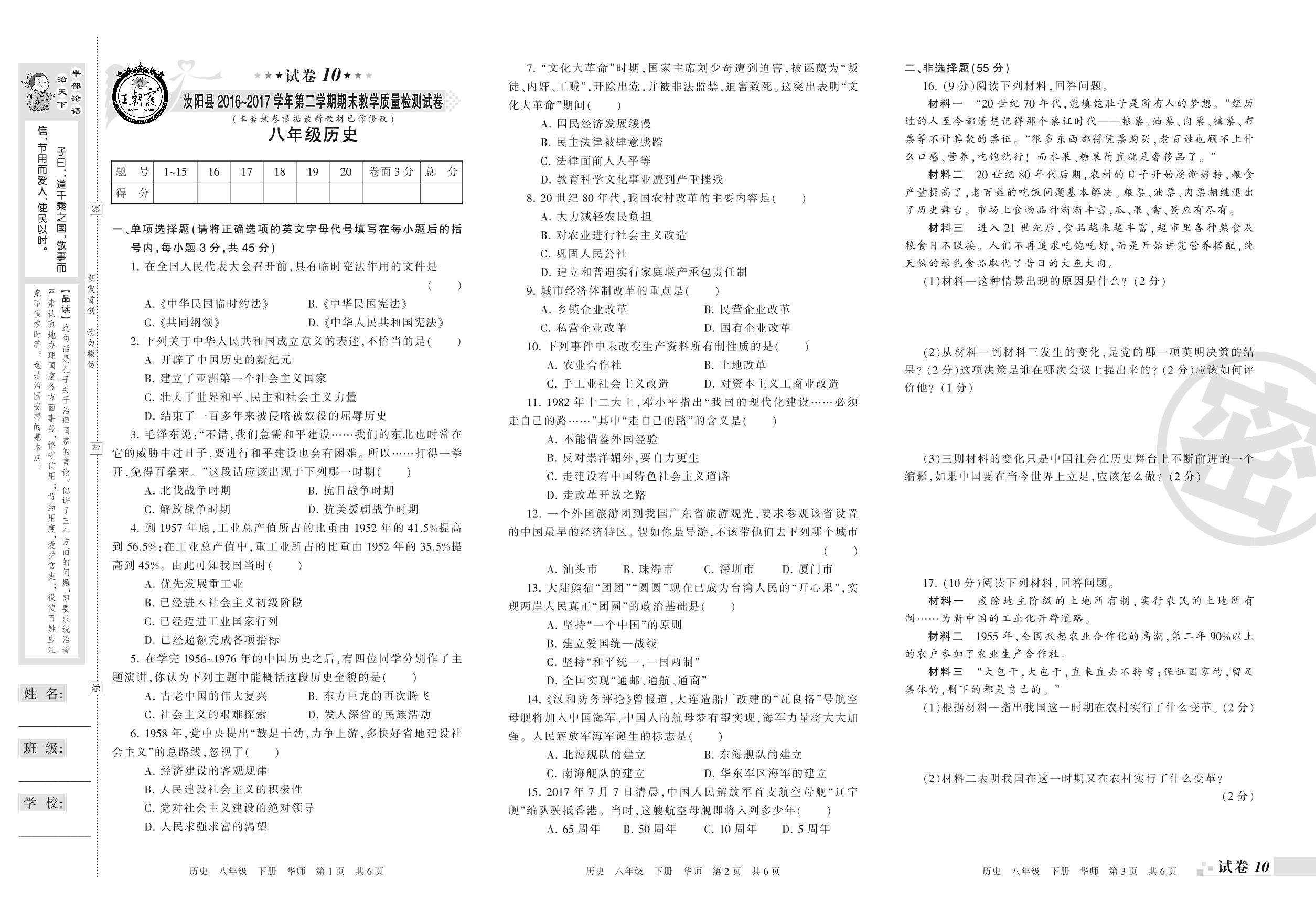2016-2017学年第二学期洛阳市汝阳县八年级历史试卷(华师版)【10】