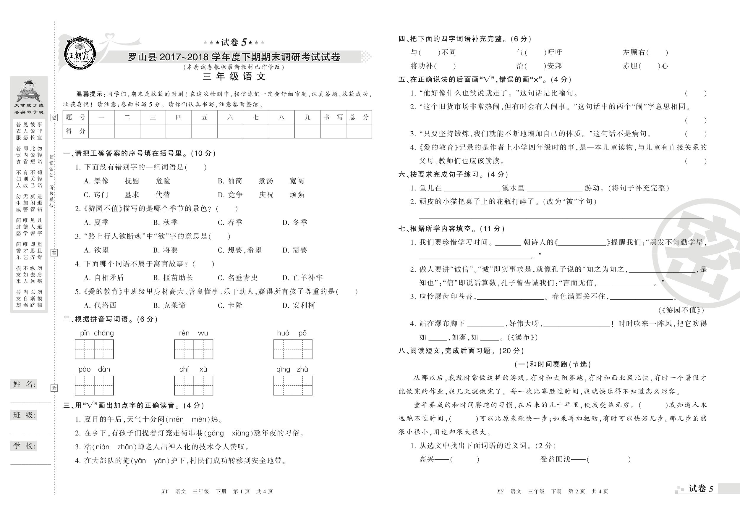 2017-2018学年第二学期信阳市罗山县三年级语文试卷(语文版)【5】