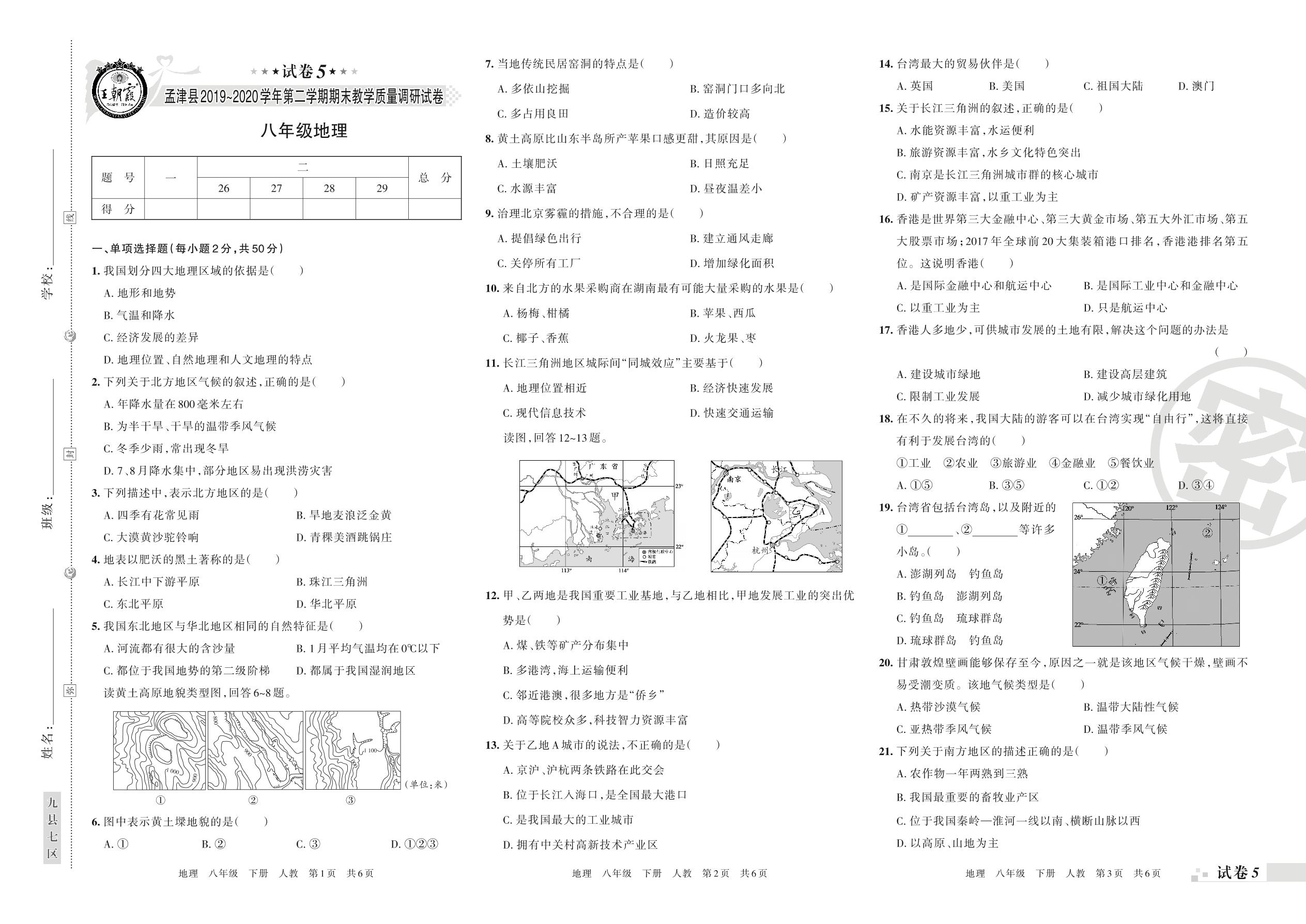 2019-2020学年第二学期洛阳市孟津县八年级地理试卷(人教版)【5】