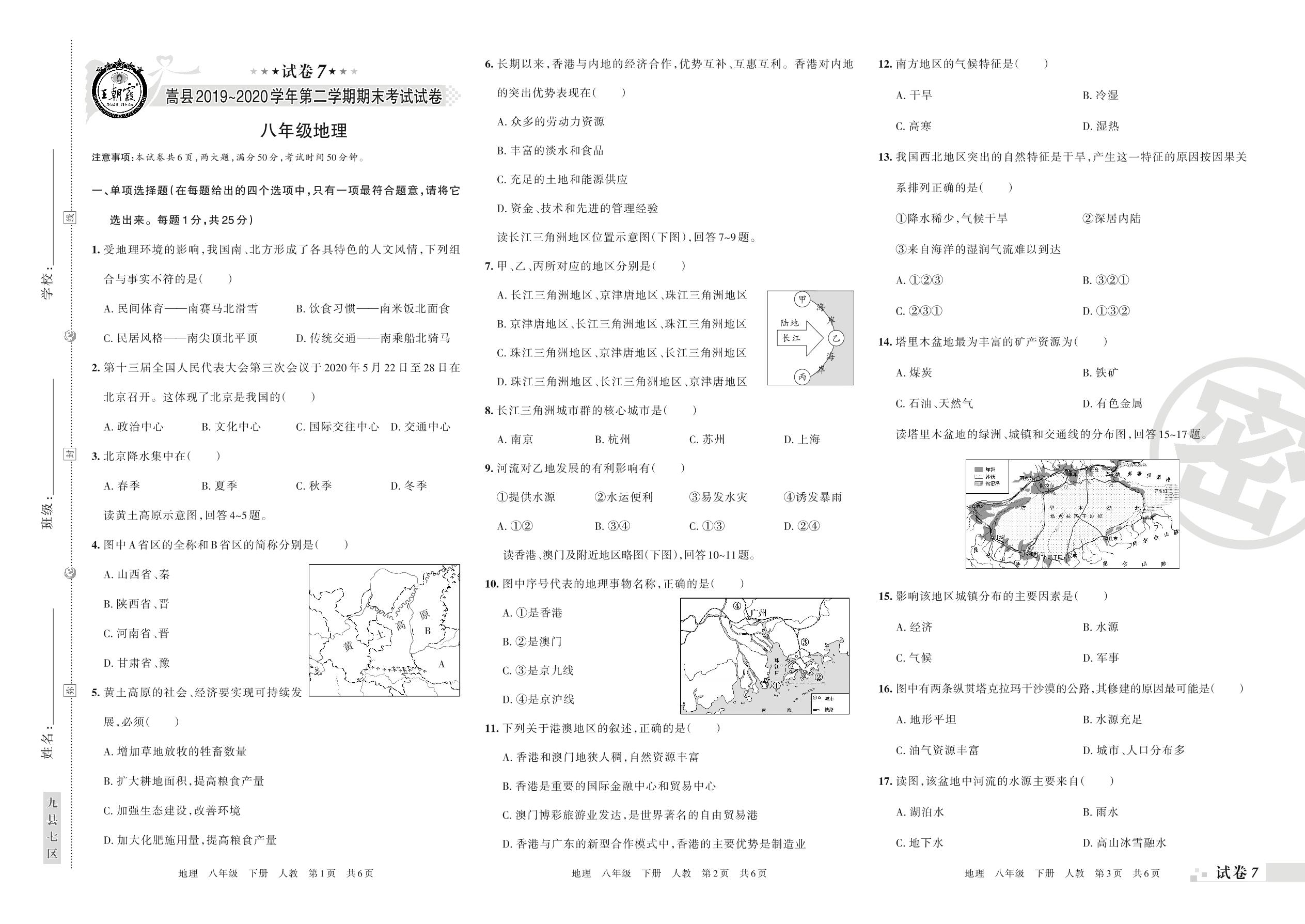 2019-2020学年第二学期洛阳市嵩县八年级地理试卷(人教版)【7】