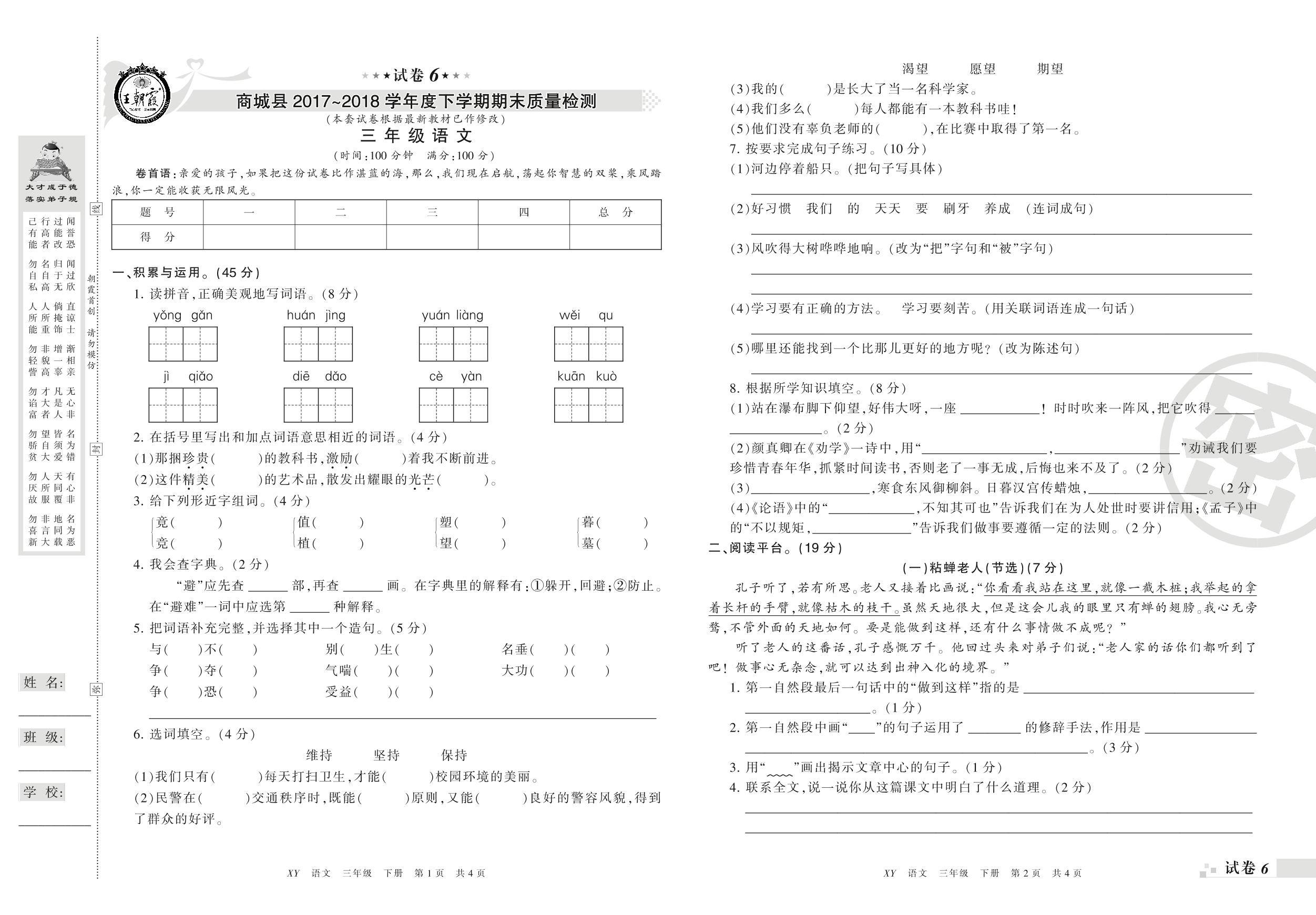 2017-2018学年第二学期信阳市商城县三年级语文试卷(语文版)【6】