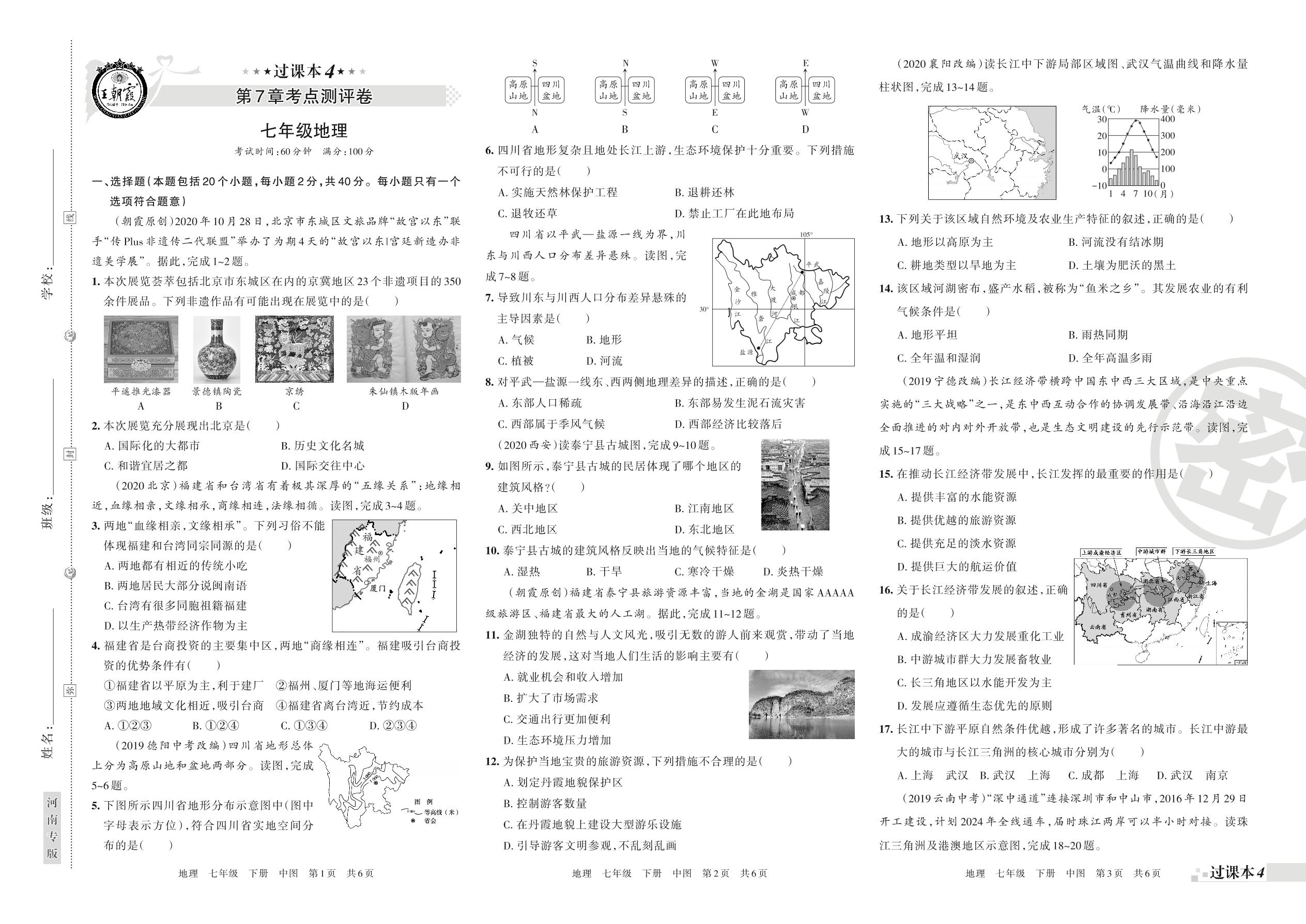 王朝霞期末过课本——第7章考点测评卷七年级下册地理(中图版)【0】